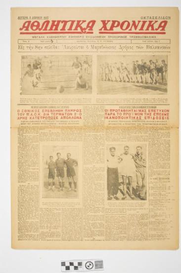 Εφημερίδα "ΑΘΛΗΤΙΚΑ ΧΡΟΝΙΚΑ". Αθλητική εφημερίδα που φέρει τους τίτλους θεμάτων στο πρωτοσέλιδο "Ο ΕΘΝΙΚΟΣ ΕΠΕΒΛΗΘΗ ΠΛΗΡΩΣ ΤΟΥ Π.Α.Ο.Κ. ΔΙΑ ΤΕΡΜΑΤΩΝ 2-0 -ΑΡΗΣ ΚΑΤΕΤΡΟΠΩΣΕ ΑΠΟΛΛΩΝΑ" και "ΟΙ ΠΡΩΤΑΘΛΗΤΑΙ ΜΑΣ ΕΠΕΤΥΧΟΝ ΠΑΡΑ ΤΟ ΠΡΩΪΜΟΝ ΤΗΣ ΕΠΟΧΗΣ ΙΚΑΝΟΠΟΙΗΤΙΚΑΣ ΕΠΙΔΟΣΕΙΣ". Ημερομηνία έκδοσης: ΔΕΥΤΕΡΑ 11 ΑΠΡΙΛΙΟΥ 1932. Αριθμός φύλλου: μη αναγνώσιμο