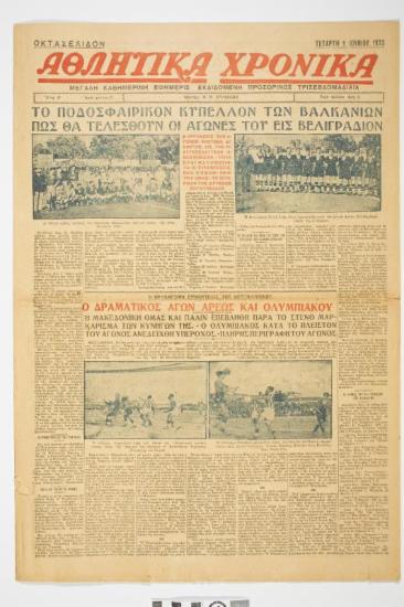Εφημερίδα "ΑΘΛΗΤΙΚΑ ΧΡΟΝΙΚΑ", μεγάλη καθημερινή εφημερίς εκδιδόμενη προσωρινώς τρισεβδομαδιαία. Το κεντρικό θέμα του πρωτοσέλιδου φέρει τον τίτλο «ΤΟ ΠΟΔΟΣΦΑΙΡΙΚΟΝ ΚΥΠΕΛΛΟΝ ΤΩΝ ΒΑΛΚΑΝΙΩΝ. ΠΩΣ ΘΑ ΤΕΛΕΣΘΟΥΝ ΟΙ ΑΓΩΝΕΣ ΤΟΥ ΕΙΣ ΒΕΛΙΓΡΑΔΙΟΝ». Ακόμη, στην πρώτη σελίδα παρουσιάζεται το άρθρο «Ο ΔΡΑΜΑΤΙΚΟΣ ΑΓΩΝ ΑΡΕΩΣ ΚΑΙ ΟΛΥΜΠΙΑΚΟΥ» με υπότιτλο «Η ΜΑΚΕΔΟΝΙΚΗ ΟΜΑΣ ΚΑΙ ΠΑΛΙΝ ΕΠΕΒΛΗΘΗ ΠΑΡΑ ΤΟ ΣΤΕΝΟ ΜΑΡΚΑΡΙΣΜΑ ΤΩΝ ΚΥΝΗΓΩΝ ΤΗΣ. - Ο ΟΛΥΜΠΙΑΚΟΣ ΚΑΤΑ ΤΟ ΠΛΕΙΣΤΟΝ ΤΟΥ ΑΓΩΝΟΣ ΑΝΕΔΕΙΧΘΗ ΥΠΕΡΟΧΟΣ. - ΠΛΗΡΗΣ ΠΕΡΙΓΡΑΦΗ ΤΟΥ ΑΓΩΝΟΣ». Ημερομηνία έκδοσης: Τετάρτη, 1 Ιουνίου 1932. Αριθμός Φύλλου: 27. Χρησιμοποιείται η καθαρεύουσα.