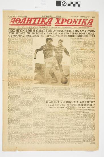 Εφημερίδα "ΑΘΛΗΤΙΚΑ ΧΡΟΝΙΚΑ". Αθλητική εφημερίδα που φέρει τον τίτλο θέματος στο πρωτοσέλιδο "ΠΩΣ ΗΓΩΝΙΣΘΗ Η ΟΜΑΣ ΤΩΝ ΑΘΗΝΩΝ ΕΙΣ ΤΗΝ ΣΜΥΡΝΗΝ" και τίτλο στήλης "Η ΑΘΛΗΤΙΚΗ ΚΙΝΗΣΙΣ ΑΙΓΥΠΤΟΥ". Ημερομηνία έκδοσης: ΤΕΤΑΡΤΗ 1 ΦΕΒΡΟΥΑΡΙΟΥ 1933. Αριθμός φύλλου: 134