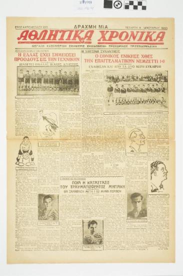 Εφημερίδα "ΑΘΛΗΤΙΚΑ ΧΡΟΝΙΚΑ". Αθλητική εφημερίδα που φέρει τους τίτλους θεμάτων στο πρωτοσέλιδο " Η ΕΛΛΑΣ ΕΧΕΙ ΣΗΜΕΙΩΣΕΙ ΠΡΟΟΔΟΥΣ ΕΙΣ ΤΗΝ ΤΕΧΝΙΚΗΝ" και "Ο ΕΘΝΙΚΟΣ ΕΝΙΚΗΣΕ ΧΘΕΣ ΤΗΝ ΕΠΑΓΓΕΛΜΑΤΙΚΗΝ ΝΕΜΖΕΤΤΙ1-0". Ημερομηνία έκδοσης: ΤΕΤΑΡΤΗ 11 ΙΑΝΟΥΑΡΙΟΥ 1933. Αριθμός φύλλου:125