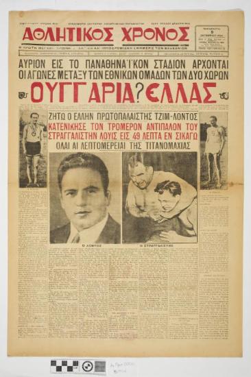 Εφημερίδα "ΑΘΛΗΤΙΚΟΣ ΧΡΟΝΟΣ". Αθλητική εφημερίδα που φέρει τον τίτλο θέματος στο πρωτοσέλιδο "ΑΥΡΙΟΝ ΕΙΣ ΤΟ ΠΑΝΑΘΗΝΑΪΚΟΝ ΣΤΑΔΙΟΝ ΑΡΧΟΝΤΑΙ ΟΙ ΑΓΩΝΕΣ ΜΕΤΑΞΥ ΤΩΝ ΕΘΝΙΚΩΝ ΟΜΑΔΩΝ ΤΩΝ ΔΥΟ ΧΩΡΩΝ ΟΥΓΓΑΡΙΑ ΕΛΛΑΣ". Ημερομηνία έκδοσης: ΠΑΡΑΣΚΕΥΗ 5 ΟΚΤΩΒΡΙΟΥ 1934. Αριθμός φύλλου: 21