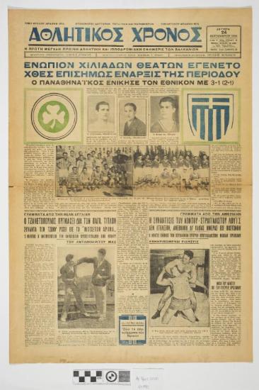 Εφημερίδα "ΑΘΛΗΤΙΚΟΣ ΧΡΟΝΟΣ". Αθλητική εφημερίδα που φέρει τον τίτλο θέματος στο πρωτοσέλιδο "ΕΝΩΠΙΟΝ ΧΙΛΙΑΔΩΝ ΘΕΑΤΩΝ ΕΓΕΝΕΤΟ ΧΘΕΣ ΕΠΙΣΗΜΩΣ ΕΝΑΡΞΙΣ ΤΗΣ ΠΕΡΙΟΔΟΥ- Ο ΠΑΝΑΘΗΝΑΪΚΟΣ ΕΝΙΚΗΣΕ ΤΟΝ ΕΘΝΙΚΟΝ ΜΕ 3-1 (2-1)". Ημερομηνία έκδοσης: ΔΕΥΤΕΡΑ 24 ΣΕΠΤΕΜΒΡΙΟΥ 1934. Αριθμός φύλλου:16