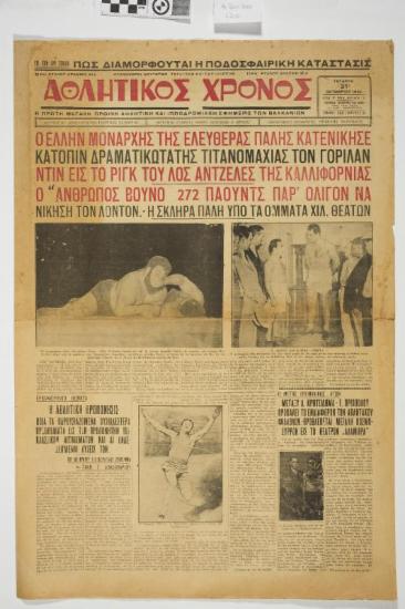 Εφημερίδα "ΑΘΛΗΤΙΚΟΣ ΧΡΟΝΟΣ". Αθλητική εφημερίδα που φέρει τον τίτλο θέματος στο πρωτοσέλιδο "Ο ΕΛΛΗΝ ΜΟΝΑΡΧΗΣ ΤΗΣ ΕΛΕΥΘΕΡΑΣ ΠΑΛΗΣ ΚΑΤΕΝΙΚΗΣΕ ΚΑΤΟΠΙΝ ΔΡΑΜΑΤΙΚΩΤΑΤΗΣ ΤΙΤΑΝΟΜΑΧΙΑΣ ΤΟΝ ΓΟΡΙΛΑΝ ΝΤΙΝ ΕΙΣ ΤΟ ΡΙΓΚ ΤΟΥ ΛΟΣ ΑΝΤΖΕΛΕΣ ΤΗΣ ΚΑΛΛΙΦΟΡΝΙΑΣ"- "Ο ΑΝΘΡΩΠΟΣ ΒΟΥΝΟ 272 ΠΑΟΥΝΤΣ ΠΑΡ'ΟΛΙΓΟΝ ΝΑ ΝΙΚΗΣΗ ΤΟΝ ΛΟΝΤΟΝ- Η ΣΚΛΗΡΗ ΠΑΛΗ ΥΠΟ ΤΑ ΟΜΜΑΤΑ ΧΙΛ. ΘΕΑΤΩΝ". Ημερομηνία έκδοσης: ΤΕΤΑΡΤΗ 31 ΟΚΤΩΒΡΙΟΥ 1934. Αριθμός φύλλου: 33