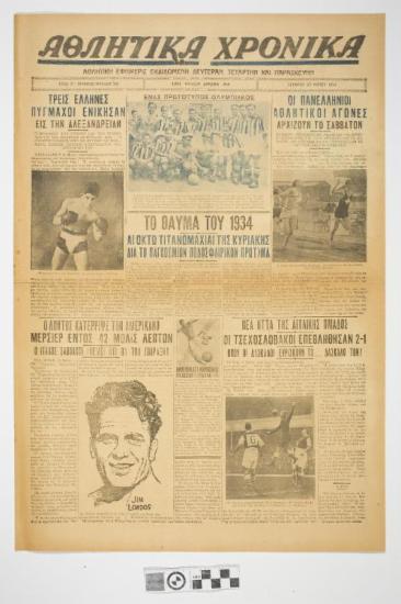 Εφημερίδα "ΑΘΛΗΤΙΚΑ ΧΡΟΝΙΚΑ". Αθλητική εφημερίδα που φέρει τους τίτλους θεμάτων στο πρωτοσέλιδο "ΤΟ ΘΑΥΜΑ ΤΟΥ 1934- ΑΙ ΟΚΤΩ ΤΙΤΑΝΟΜΑΧΙΑΙ ΤΗΣ ΚΥΡΙΑΚΗΣ ΔΙΑ ΤΟ ΠΑΓΚΟΣΜΙΟΝ ΠΟΔΟΣΦΑΙΡΙΚΟΝ ΠΡΩΤ)ΜΑ", "ΟΙ ΠΑΝΕΛΛΗΝΙΟΙ ΑΘΛΗΤΙΚΟΙ ΑΓΩΝΕΣ ΑΡΧΙΖΟΥΝ ΤΟ ΣΑΒΒΑΤΟΝ", "ΤΡΕΙΣ ΕΛΛΗΝΕΣ ΠΥΓΜΑΧΟΙ ΕΝΙΚΗΣΑΝ ΕΙΣ ΤΗΝ ΑΛΕΞΑΝΔΡΕΙΑ", "Ο ΛΟΝΤΟΣ ΚΑΤΕΡΡΙΨΕ ΤΟΝ ΑΜΕΡΙΚΑΝΟ ΜΕΡΣΙΕΡ ΕΝΤΟΣ 42 ΜΟΛΙΣ ΛΕΠΤΩΝ" και "ΝΕΑ ΗΤΤΑ ΤΗΣ ΑΓΓΛΙΚΗΣ ΟΜΑΔΟΣ-ΟΙ ΤΣΕΧΟΣΛΟΒΑΚΟΙ ΕΠΕΒΛΗΘΗΣΑΝ 2-1". Ημερομηνία έκδοσης: ΤΕΤΑΡΤΗ 23 ΜΑΪΟΥ 1934. Αριθμός φύλλου: 318 (EL)