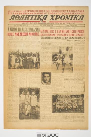 Εφημερίδα "ΑΘΛΗΤΙΚΑ ΧΡΟΝΙΚΑ". Αθλητική εφημερίδα που φέρει τους τίτλους θεμάτων στο πρωτοσέλιδο "ΑΣΥΓΚΡΑΤΗΤΟΣ Ο ΟΛΥΜΠΙΑΚΟΣ ΚΑΤΕΤΡΟΠΩΣΕ ΧΘΕΣ ΤΗΝ ΟΜΑΔΑ ΤΟΥ ΔΟΥΔΙ ΜΕ 7 ΤΕΡΜΑΤΑ ΕΝΑΝΤΙ 1" και "Η ΧΘΕΣΙΝΗ ΕΘΝΙΚΗ ΣΚΥΤΑΛΟΔΡΟΜΙΑ-ΠΟΙΟΣ ΑΝΕΔΕΙΧΘΗ ΝΙΚΗΤΗΣ". Ημερομηνία έκδοσης: ΔΕΥΤΕΡΑ 2 ΑΠΡΙΛΙΟΥ 1934. Αριθμός φύλλου: 295