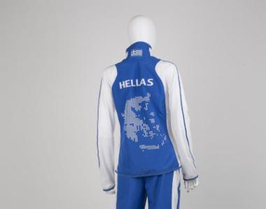 Ζακέτα, λευκού χρώματος με την αναπαράσταση του χάρτη της Ελλάδας στην πίσω πλευρά, τμήμα της επίσημης στολής της εθνικής ομάδας στίβου των Ολυμπιακών Αγώνων του Πεκίνου το 2008. Προέρχεται από τη συλλογή της ολυμπιονίκη Χρυσοπηγής Δεβετζή. (EL)