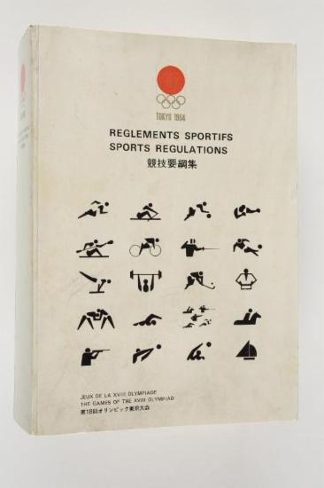 Βιβλίο με τον τίτλο "REGLEMENTS SPORTIFS SPORTS REGULATIONS" από τους Ολυμπιακούς Αγώνες του Τόκιο το 1964. Στο λευκό εξώφυλλο εικονίζονται πικτογράμματα Ολυμπιακών Αθλημάτων και το έμβλημα της διοργάνωσης.