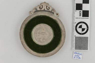 Αντίγραφο μεταλλίου των Παραολυμπιακών Αγώνων του 2008. Αργυρό μετάλλιο κολύμβησης, 50 μ. ύπτιο. Στην μπροστινή όψη φέρει τρεις ομόκεντρους κύκλους. Ο μεσαίος είναι κράμα από ιαδεΐτη και νεφρίτη, πράσινου χρώματος. Ενώ στον μικρότερο κύκλο αναγράφεται "Beijing 2008, Paralympic Games" και εικονίζονται το σήμα της διοργάνωσης των Παραολυμπιακών Αγώνων του 2008 και το σήμα των Παραολυμπιακών Αγώνων. Στην πίσω όψη υπάρχουν τα στοιχεία της διοργάνωσης στην κινέζικη γλώσσα, σε γραφή Μπράιγ και στην αγγλική γλώσσα. Επίσης και το σήμα της Διεθνούς Παραολυμπιακούς Επιτροπής. Η πόρπη του μεταλλίου έχει καλλιγραφικό διακοσμητικό μοτίβο. (EL)