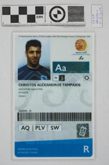 Κάρτα διαπίστευσης του αθλητή Χρήστου Ταμπαξή από τους Παραολυμπιακούς Αγώνες Αθήνα 2004