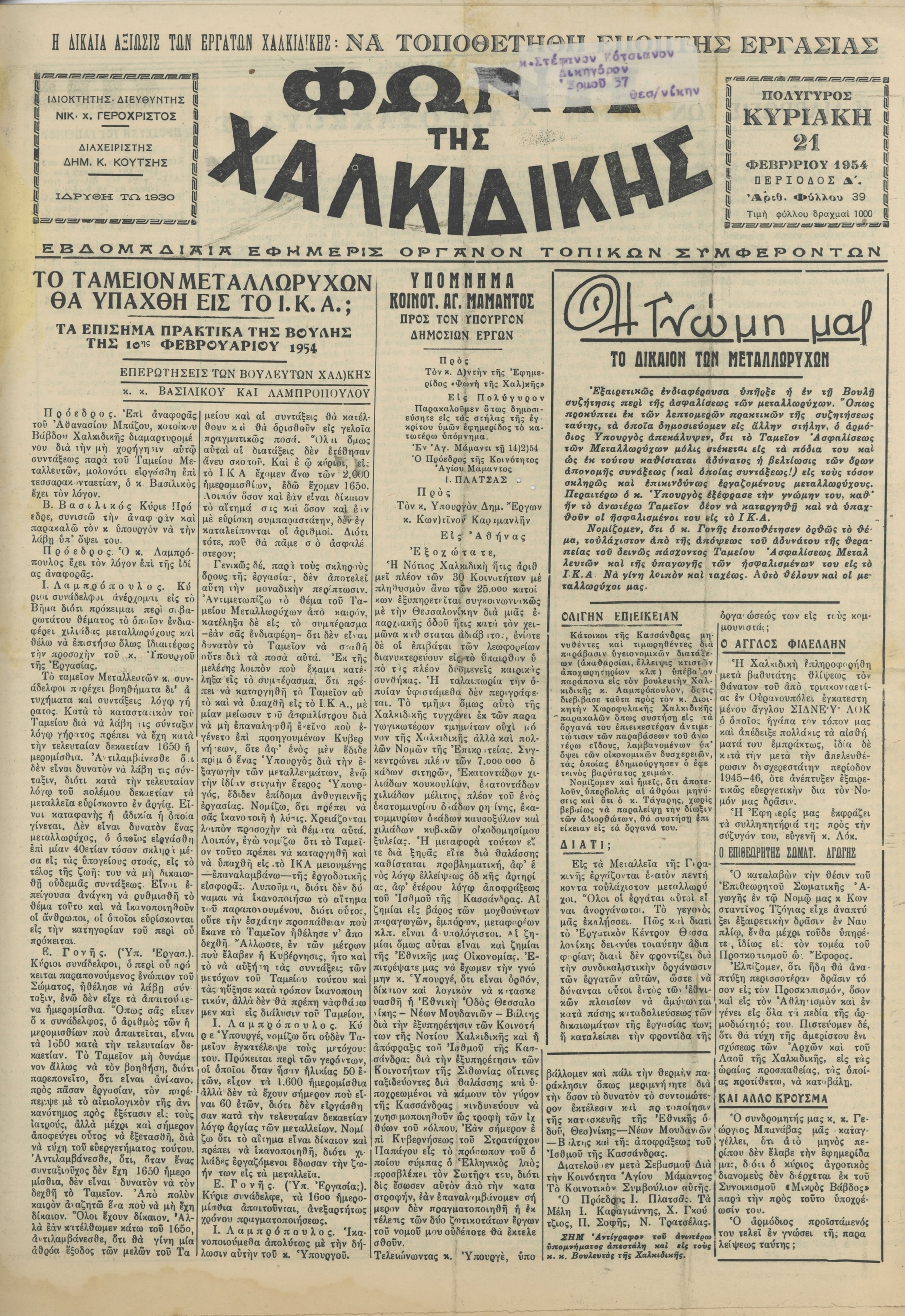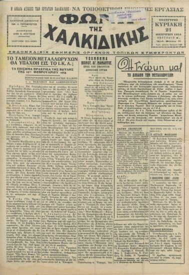 Φωνή της Χαλκιδικής 21-02-54 Αρ. Φύλλου 39