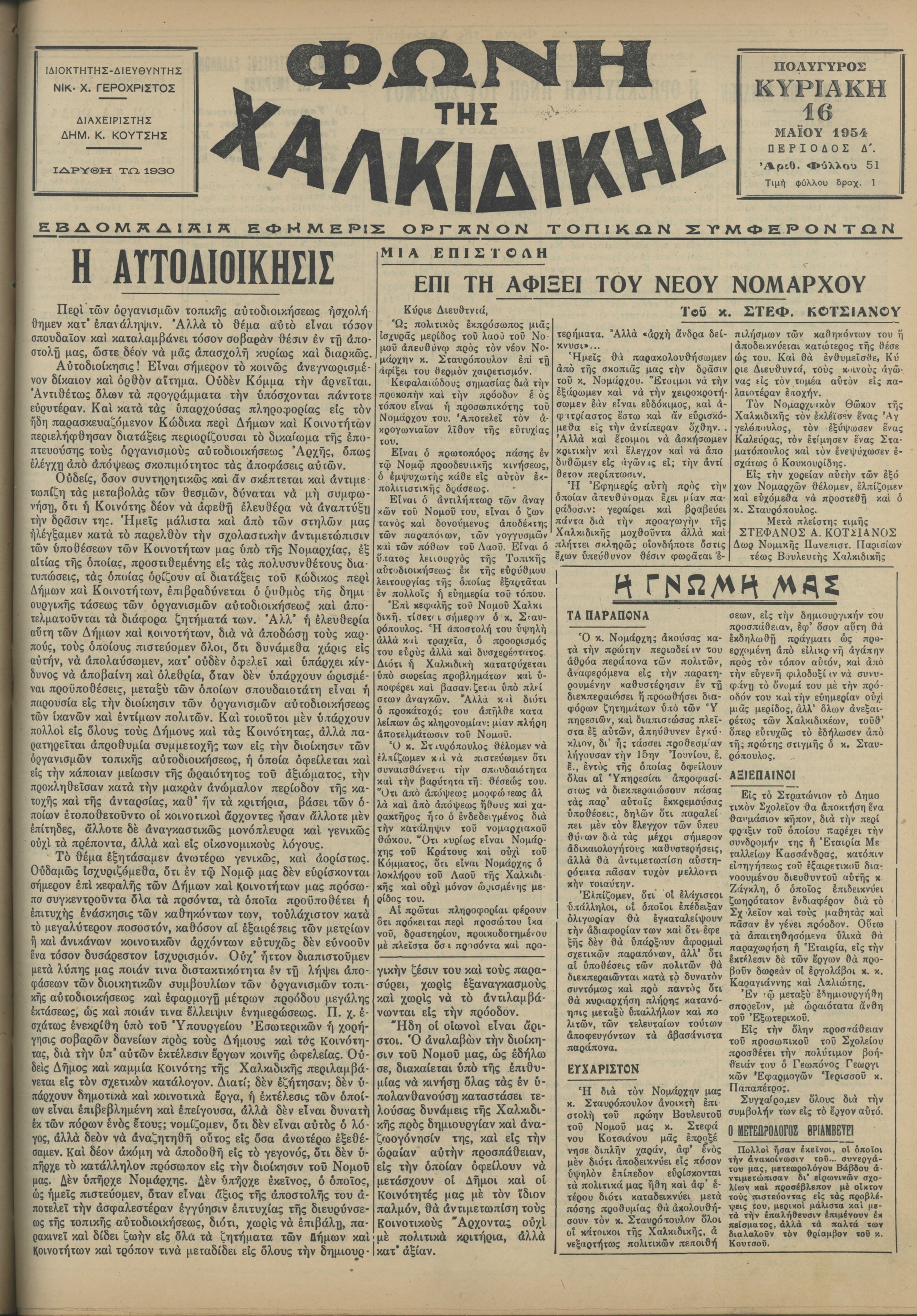 Φωνή της Χαλκιδικής 16-05-54 Αρ. Φύλλου 51