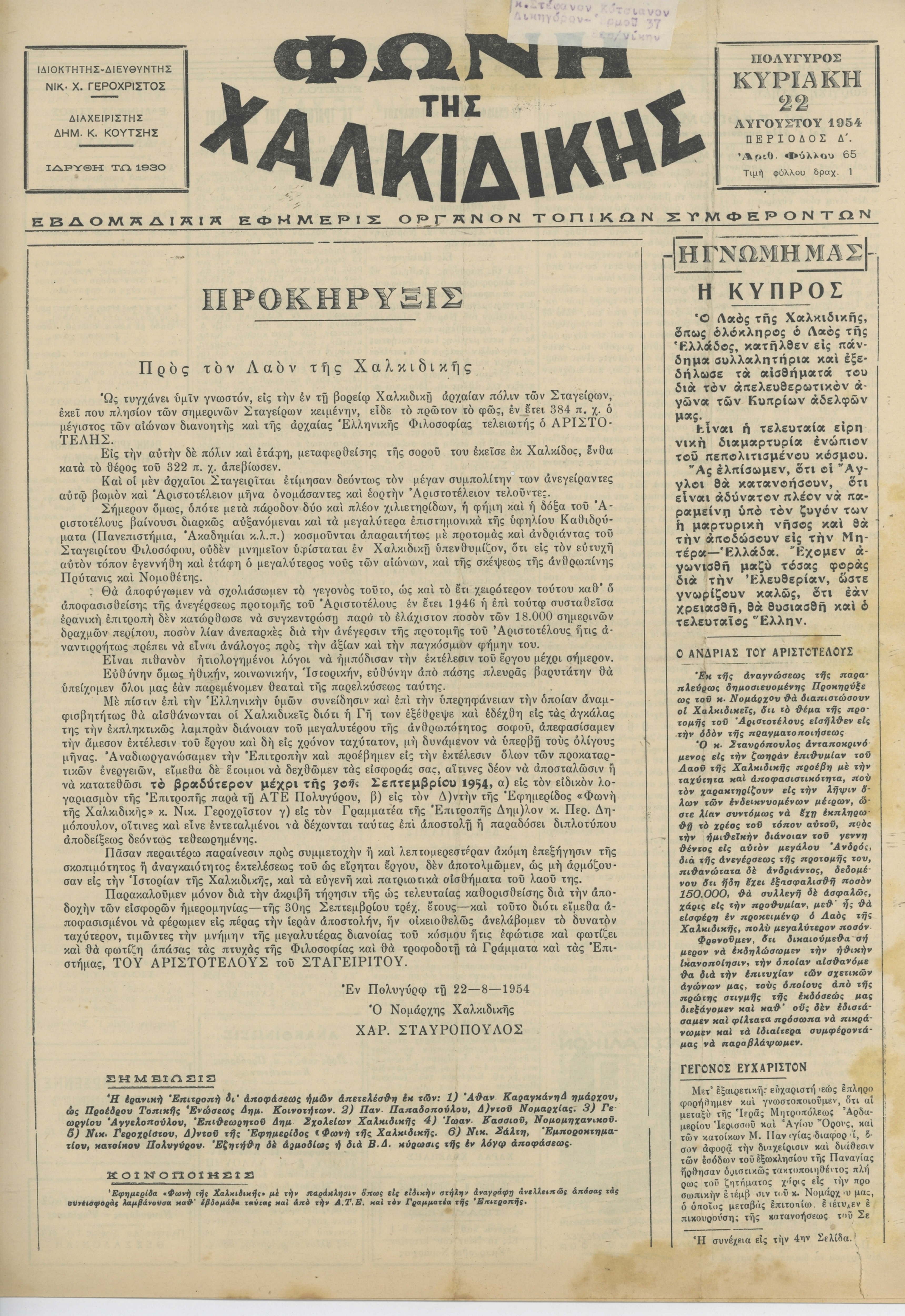 Φωνή της Χαλκιδικής 22-08-54 Αρ. Φύλλου 65