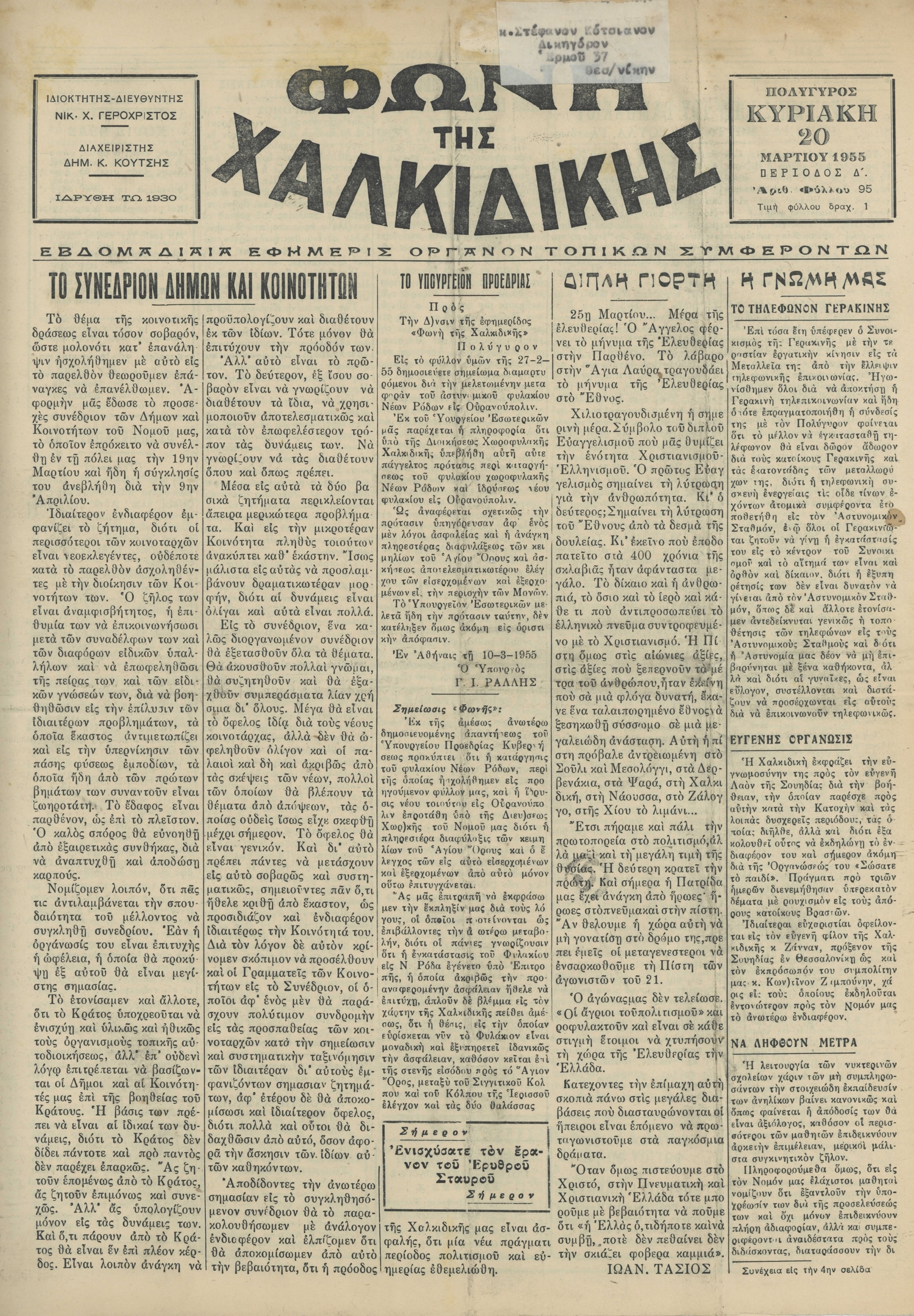 Φωνή της Χαλκιδικής 20-03-55 Αρ. Φύλλου 95