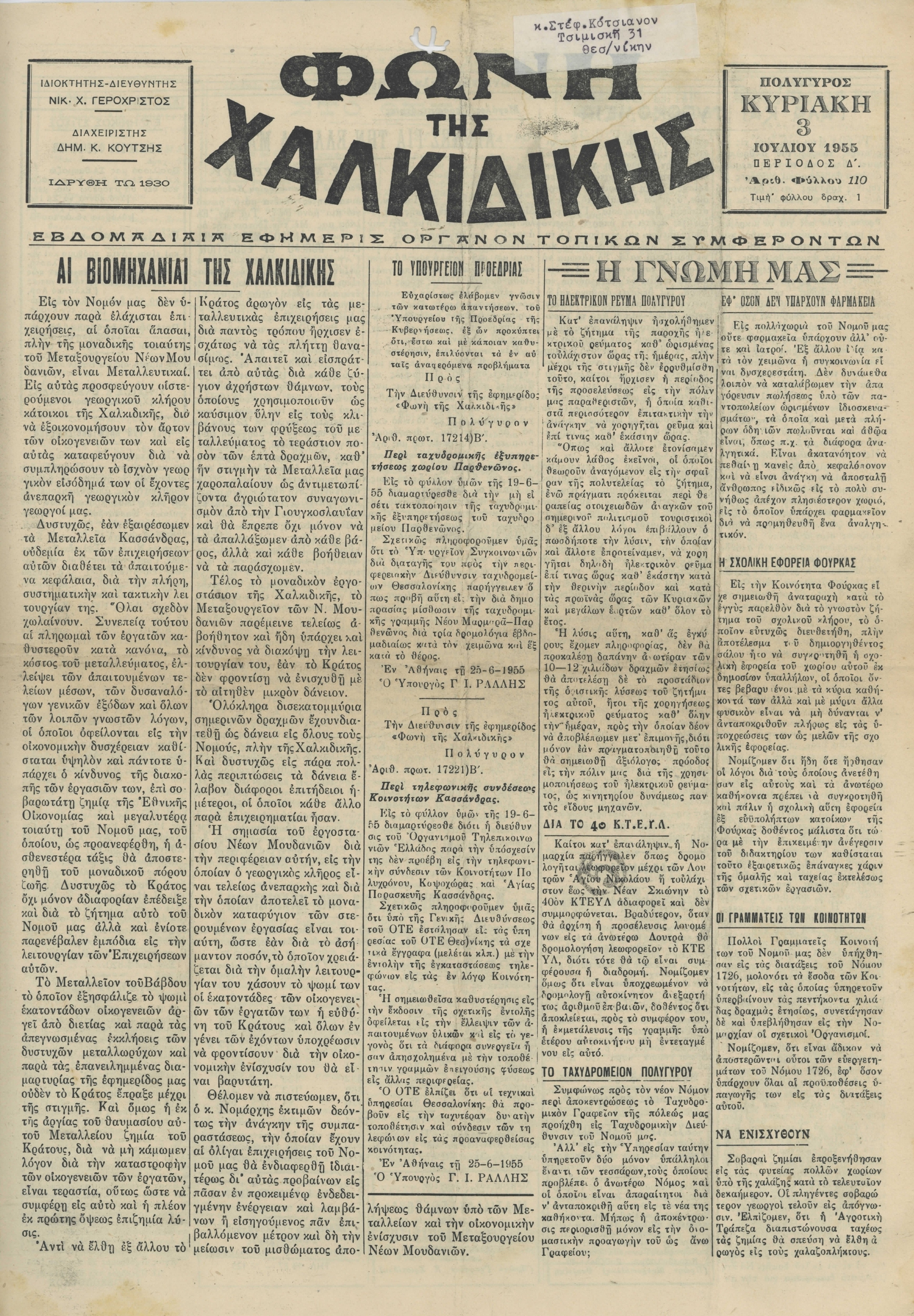 Φωνή της Χαλκιδικής 03-07-55 Αρ. Φύλλου 110