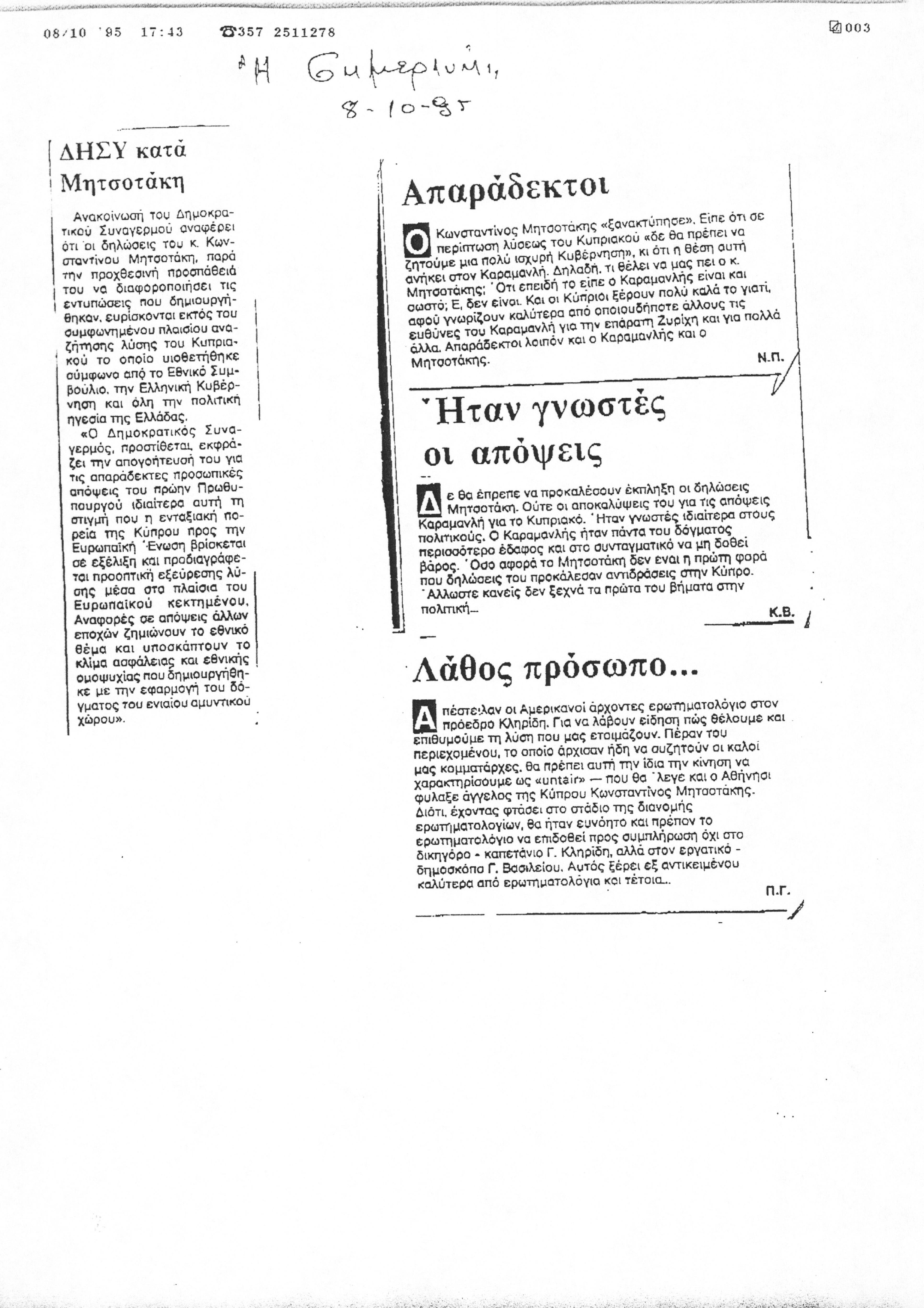 Δημοσίευμα της Εφημερίδας Η σημερινή σχετικά με τις δηλώσεις του ΚΜ για το Κυπριακό, την συνδιοίκηση της νήσου με τους Τούρκους και το Ενιαίο Αμυντικό Δόγμα Ελλάδος - Κύπρου
