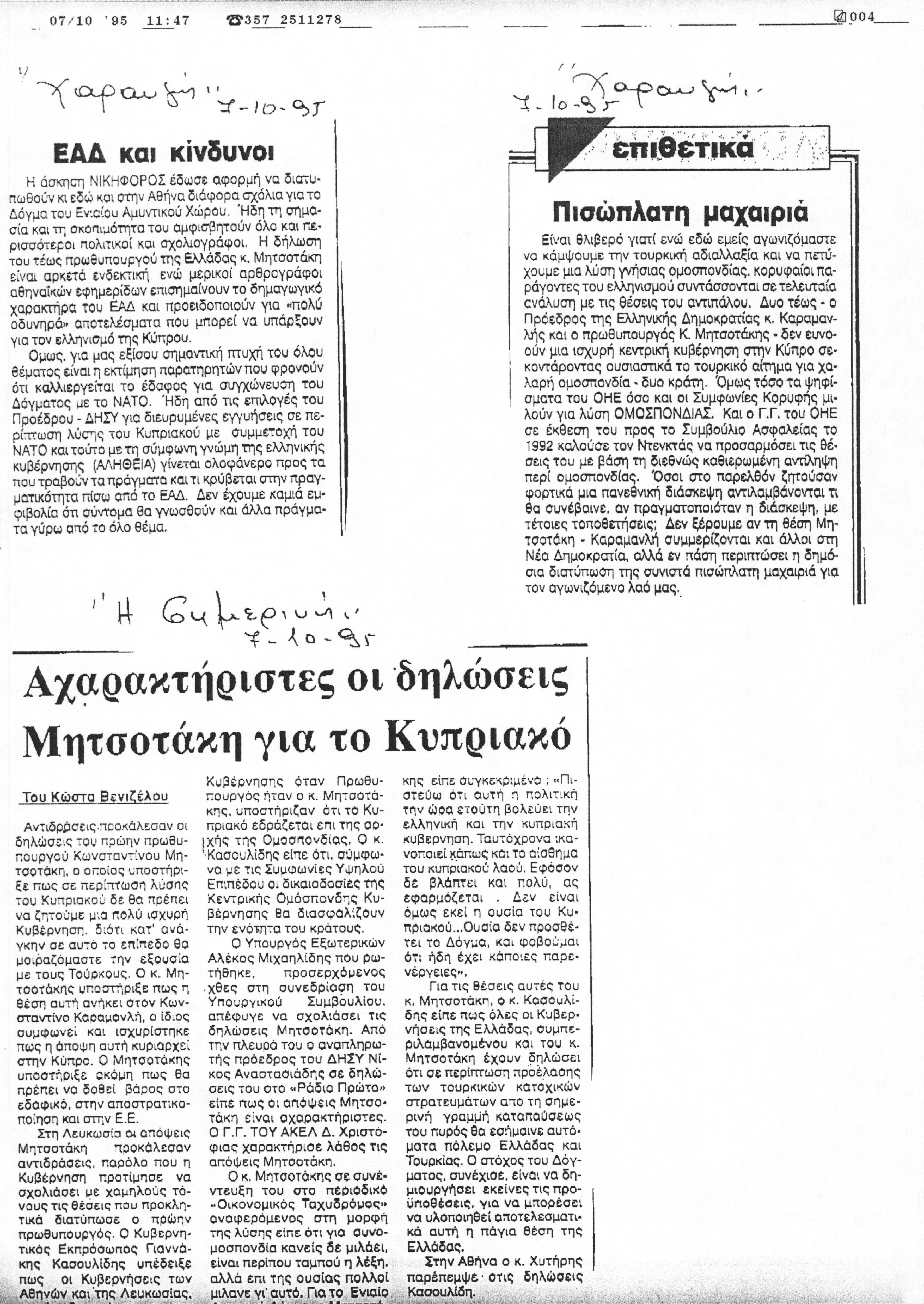 Δημοσίευμα της Εφημερίδας Η σημερινή σχετικά με τις απαντήσεις των κομμάτων της Κύπρου ΑΚΕΛ, ΔΗΚΟ και ΕΔΕΚ, αναφορικά με τις δηλώσεις του κ. Κ. Μητσοτάκη για το Κυπριακό, την συνδιοίκηση της νήσου με τους Τούρκους και το Ενιαίο Αμυντικό Δόγμα Ελλάδος - Κύπρου