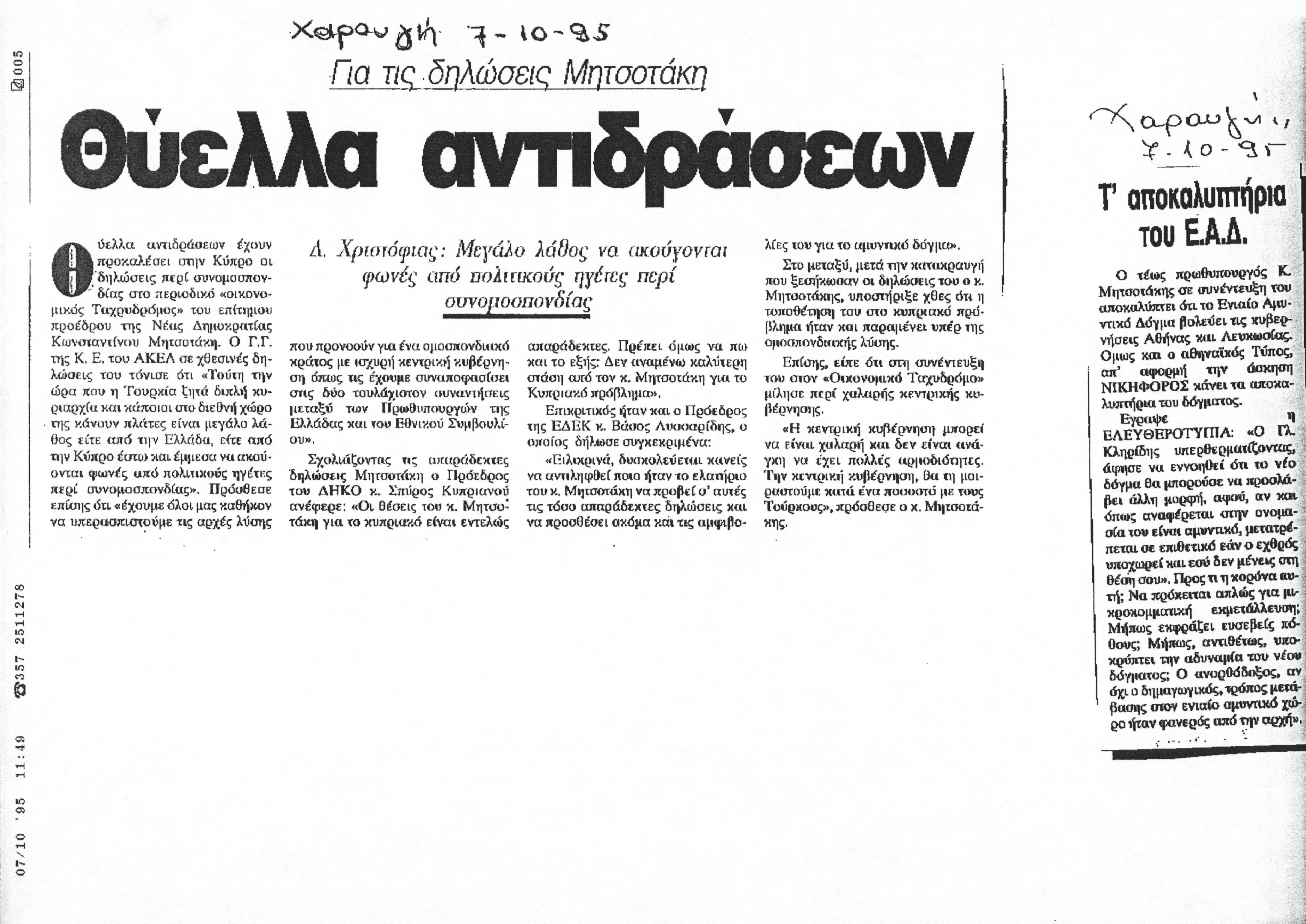 Δημοσιεύματα της Εφημερίδας Χαραυγή σχετικά με τις απαντήσεις των κομμάτων της Κύπρου ΑΚΕΛ, ΔΗΚΟ και ΕΔΕΚ, αναφορικά με τις δηλώσεις του ΚΜ για το Κυπριακό