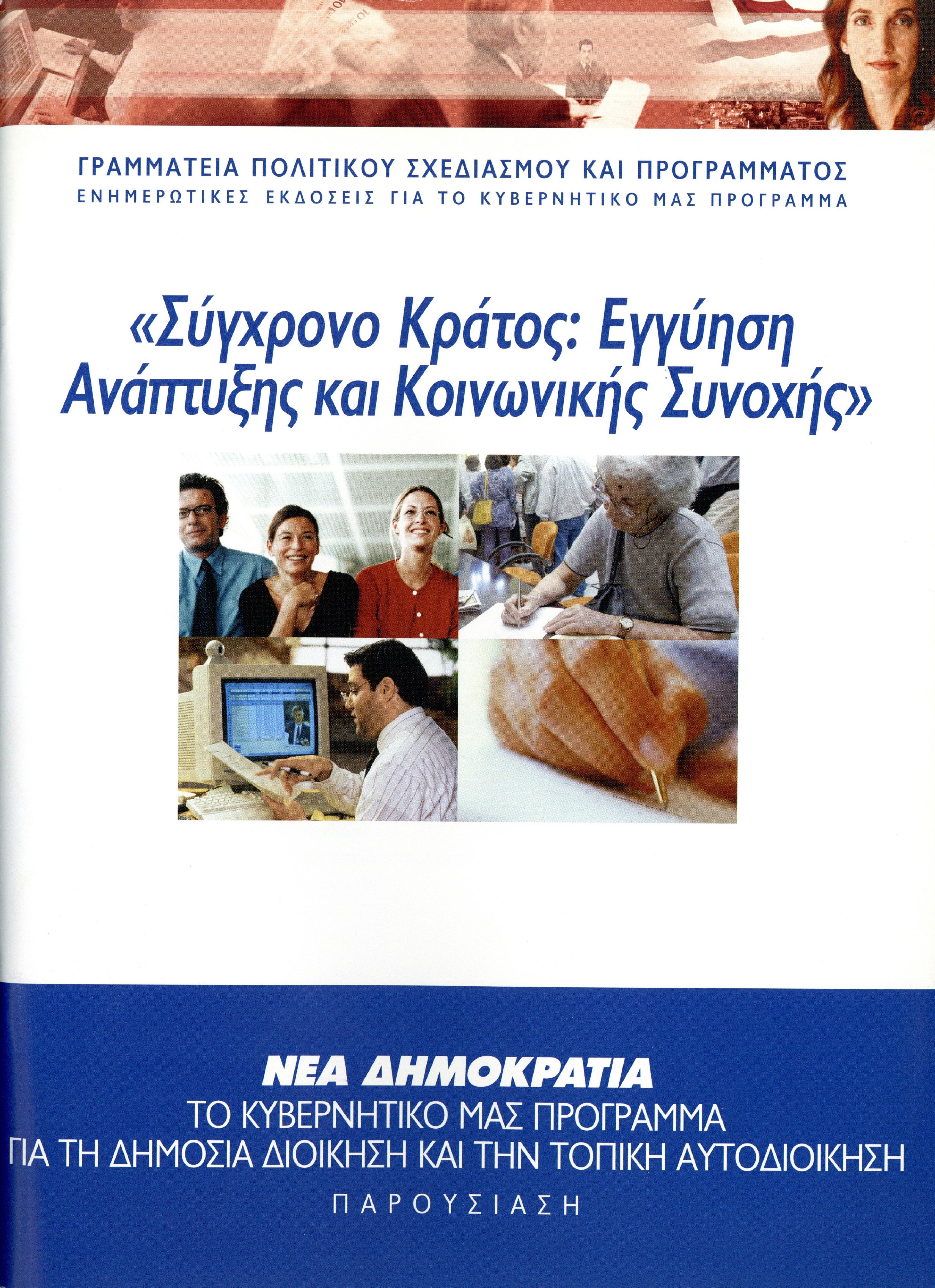 Φυλάδιο με τίτλο Σύγχρονο Κράτος: Εγγύηση Ανάπτυξης και Κοινωνικής Συνοχής που αφορά στο κυβερνητικό πρόγραμμα της ΝΔ για τη Δημόσια Διοίκηση και την Τοπική Αυτοδιοίκηση και εκδίδεται από την Γραμματεία Πολιτικού Σχεδιασμού και Προγράμματος της ΝΔ
