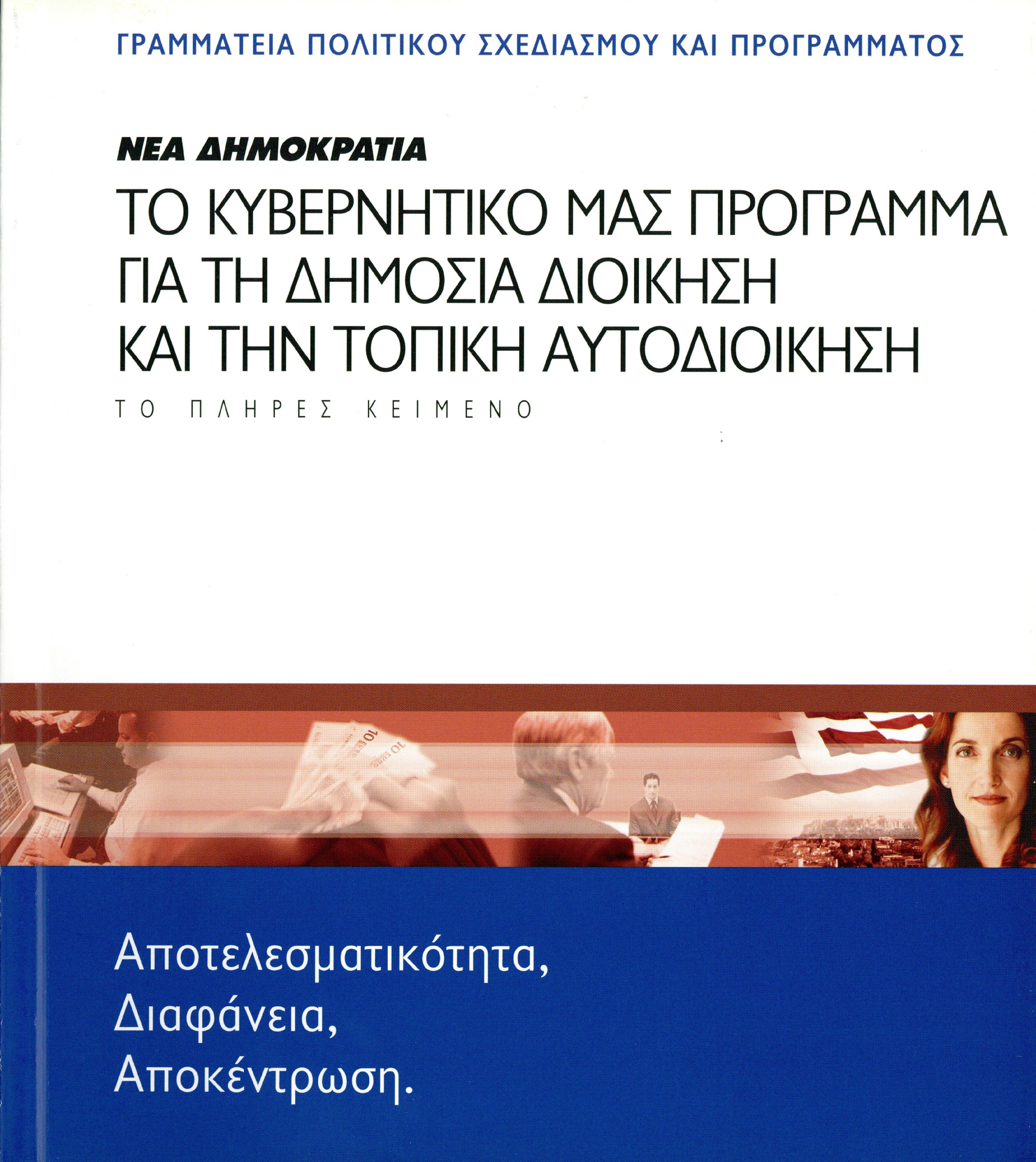 Φυλάδιο με τίτλο Νέα Δημοκρατία - Το κυβερνητικό μας πρόγραμμα για τη Δημόσια Διοίκηση και την Τοπική Αυτοδιοίκηση που αναφέρεται αναλυτικά στο σκοπό και στους στόχους του προτεινόμενου προγράμματος της ΝΔ για την Δημόσια Διοίκηση και την Τοπική Αυτοδιοίκηση και εκδίδεται από την Γραμματεία Πολιτικού Σχεδιασμού και Προγράμματος της ΝΔ