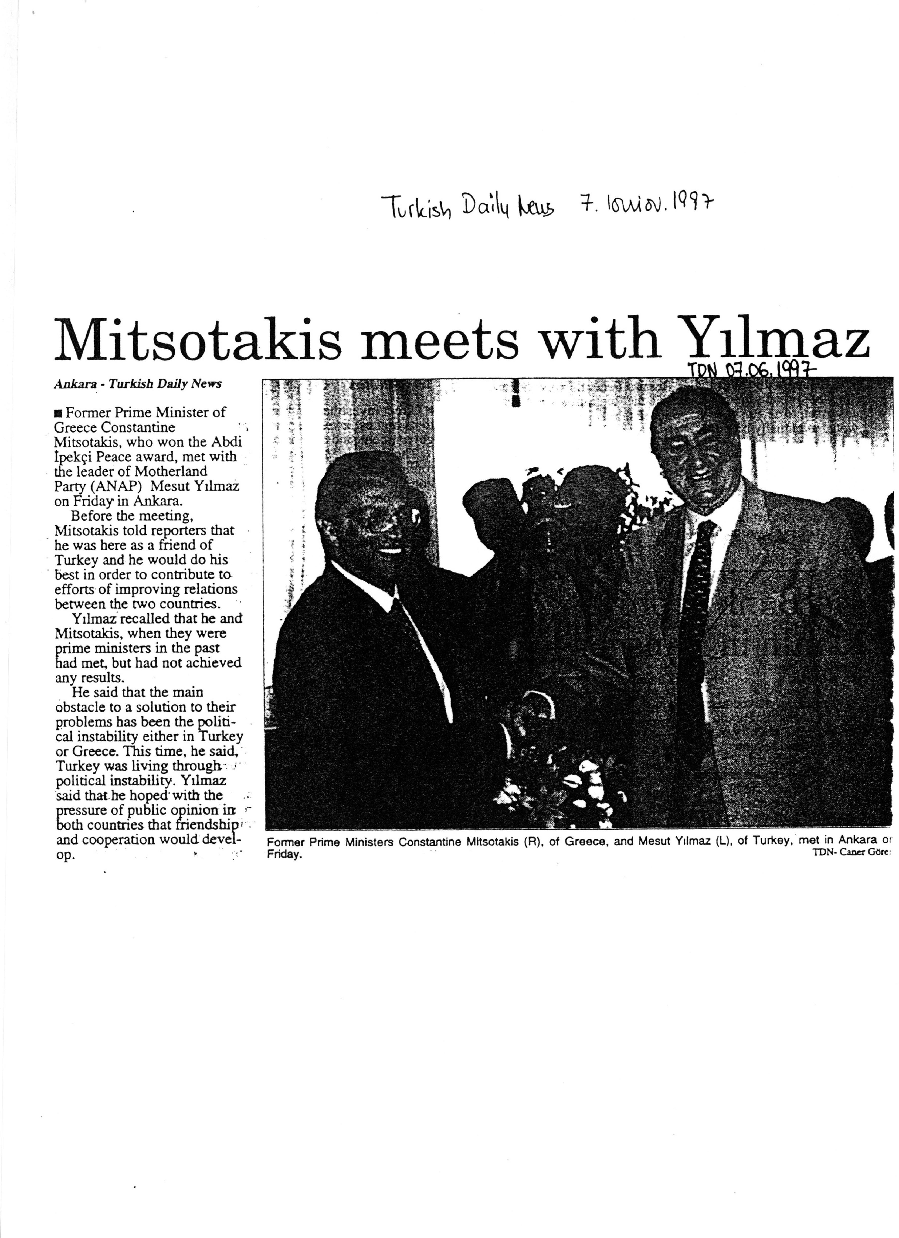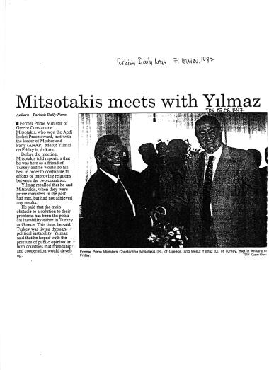 Δημοσίευμα στην εφημερίδα Turkish Daily News σχετικά με την τελετή διεξαγωγής των 8ων Βραβείων Ειρήνης και Φιλίας Abdi Ipekci που έγινε στα κεντρικά γραφεία της εφημερίδας Milliyet στο Dogan Medya Center. Το βραβείο απονεμήθηκε στον ΚΜ.