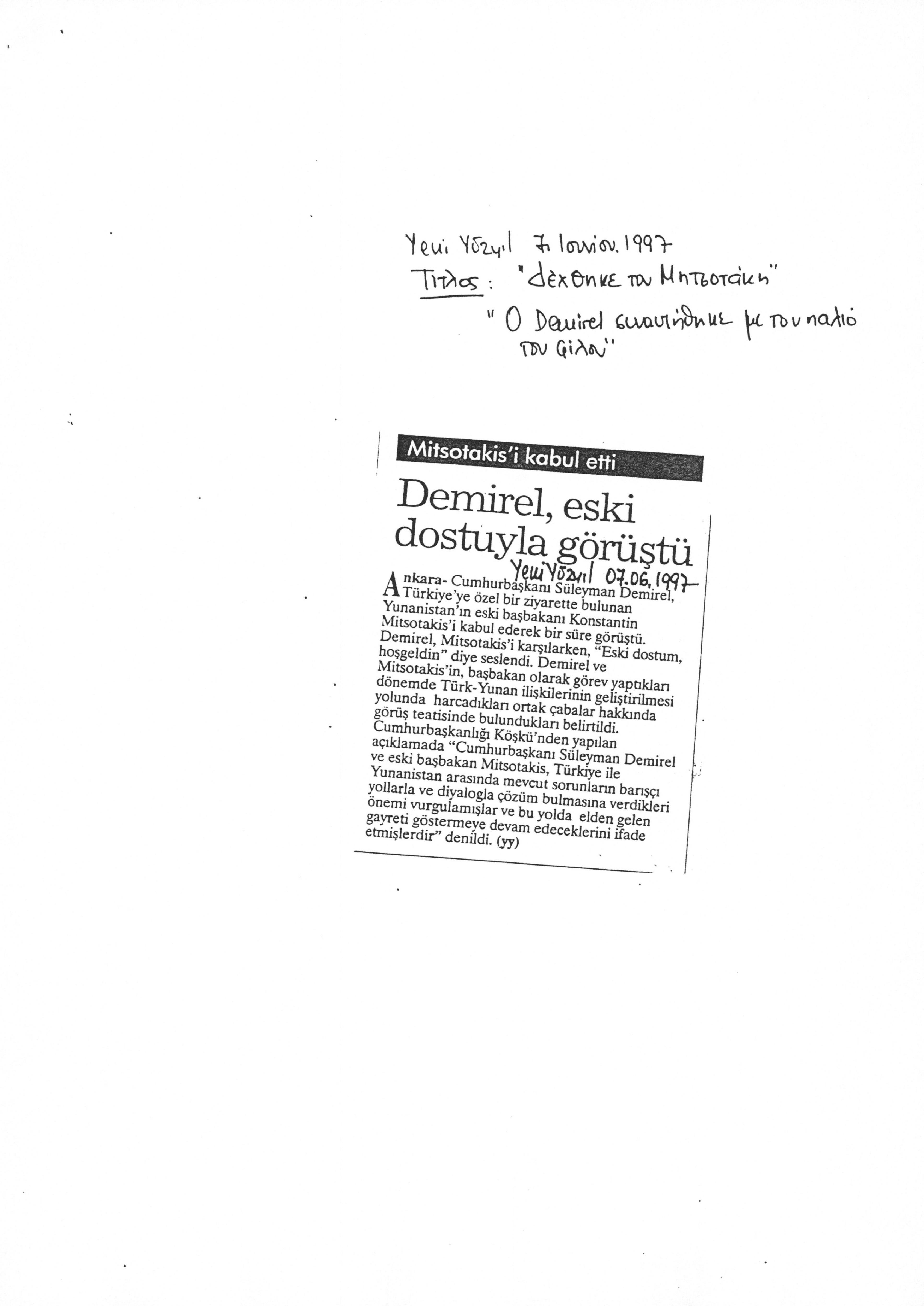 Δημοσίευμα στην εφημερίδα Yeni Yuzyil σχετικά με την τελετή διεξαγωγής των 8ων Βραβείων Ειρήνης και Φιλίας Abdi Ipekci. Το βραβείο απονεμήθηκε στον ΚΜ.
