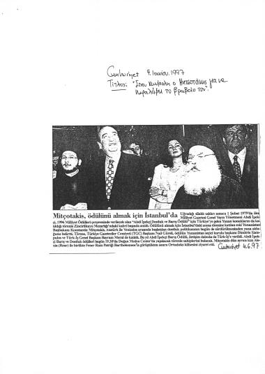 Δημοσίευμα στην εφημερίδα Gumhuriyet σχετικά με την τελετή διεξαγωγής των 8ων Βραβείων Ειρήνης και Φιλίας Abdi Ipekci. Το βραβείο απονεμήθηκε στον ΚΜ.