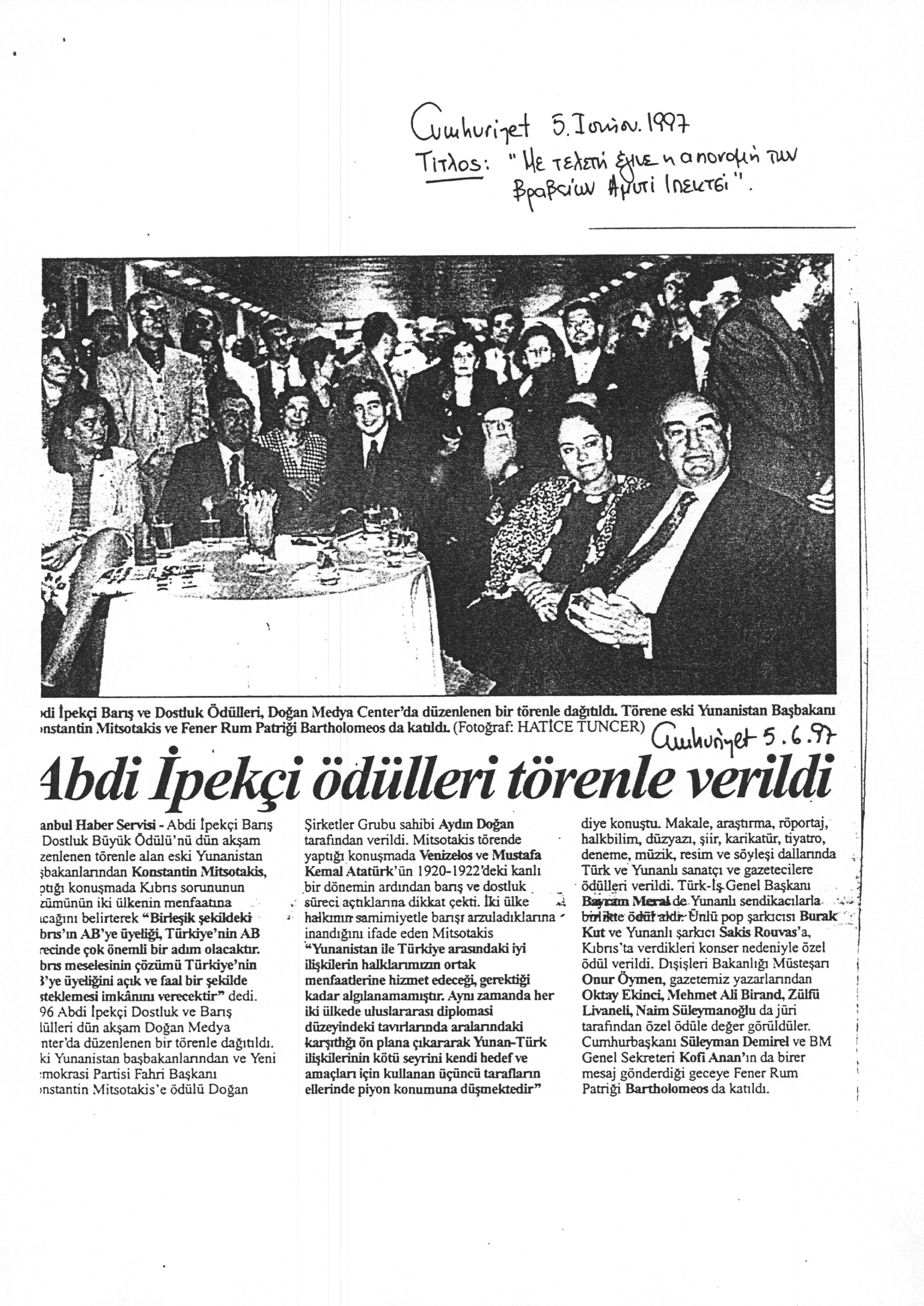 Δημοσίευμα στην εφημερίδα Gumhuriyet σχετικά με την τελετή διεξαγωγής των 8ων Βραβείων Ειρήνης και Φιλίας Abdi Ipekci. Το βραβείο απονεμήθηκε στον ΚΜ.