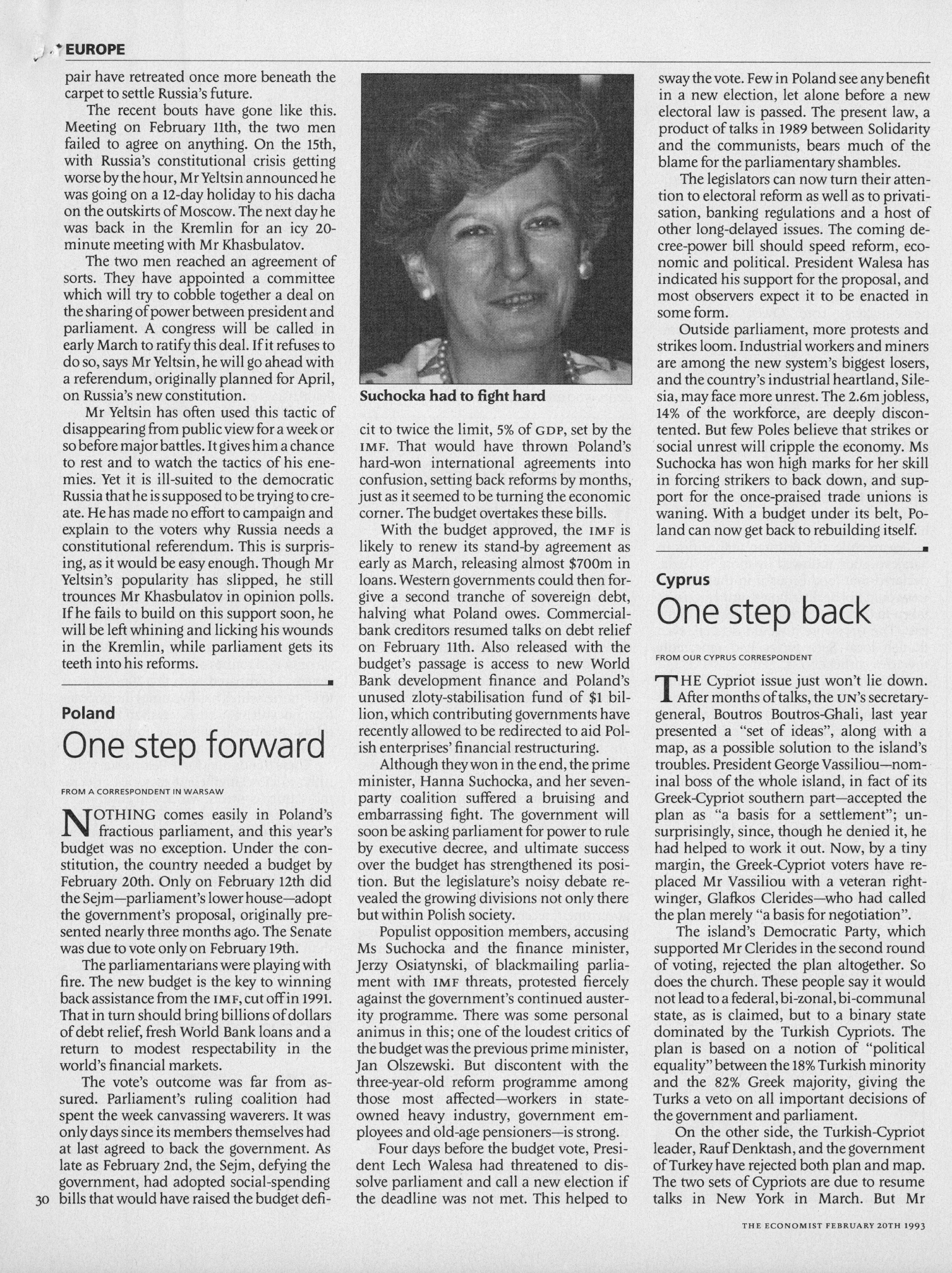 Δημοσίευμα στο περιοδικό The Economist, σχετικά με το πρόβλημα της Κύπρου. Το άρθρο αναλύει την πρόταση του Γενικού Γραμματέα του ΟΗΕ Gali,Boutros Boutros, το οποίο ο Πρόεδρος Βασιλείου,Γιώργος κατ'αρχάς αποδέχθηκε ως 'ένα σχέδιο λύσης' αλλά στη συνέχεια λόγω εκλογών, ο νέος εκλεγμένος Πρόεδρος Κληρίδης,Γλάυκος αποδέχθηκε ως 'ενα σχέδιο για διαπραγμάτευση'. Η άλλη πλευρά του Προέδρου Denktash,Rauf δεν αποδέχεται το σχέδιο. Οι διαπραγματεύσεις θα συνεχιστούν στον ΟΗΕ.