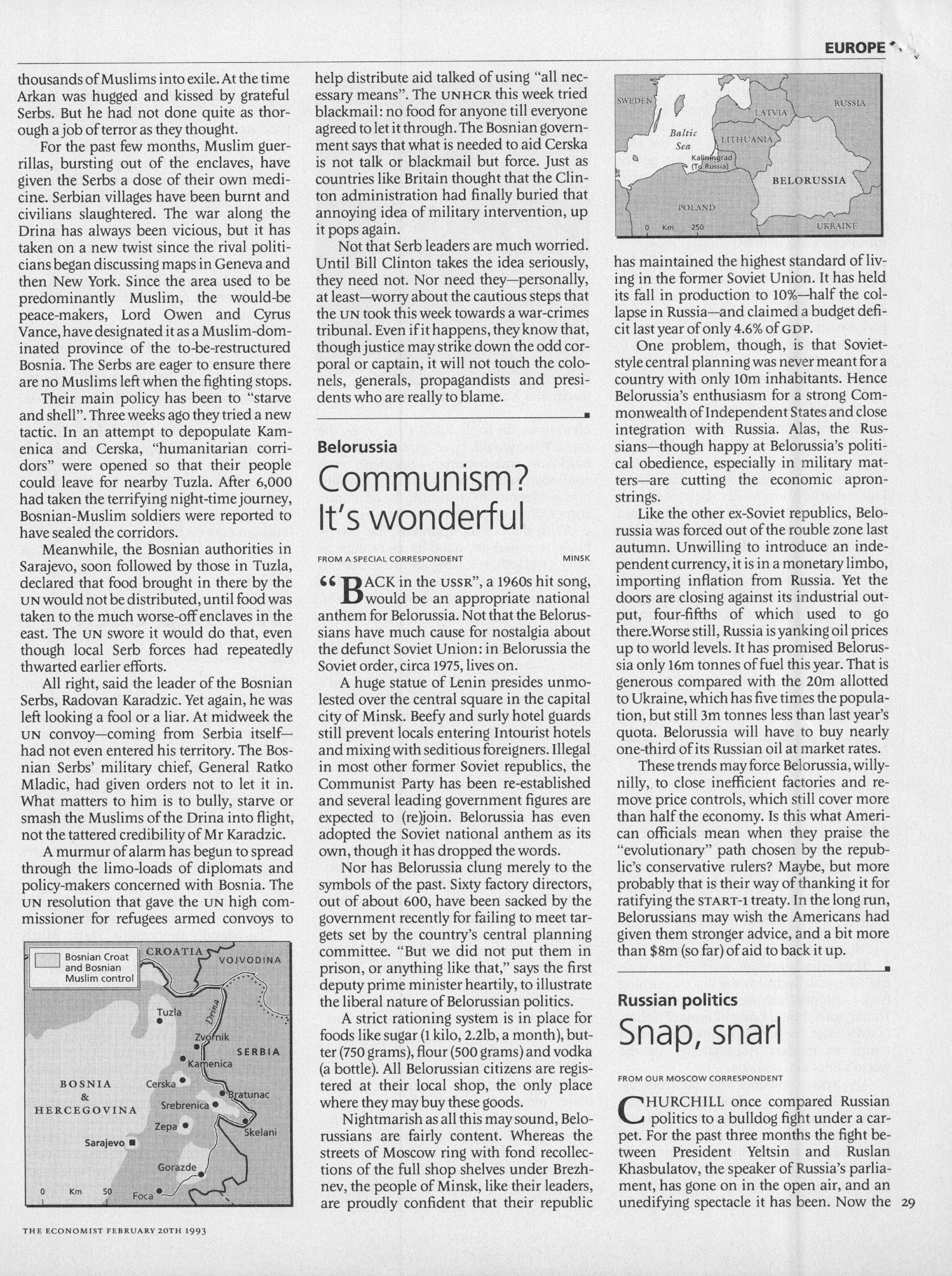 Δημοσίευμα στο περιοδικό The Economist, στο οποίο περιγράφεται η προσήλωση της Λευκορωσίας στη Σοβιετική Ενωση. Το άρθρο εμβαθύνει σε θέματα κόστους ζωής 'με το δελτίο', θέματα οικονομικής διαχείρισης και επιχειρηματικότητας, θέματα ενέργειας και γενικά εμπορικά θέματα σε σχέση με τη Ρωσία.
