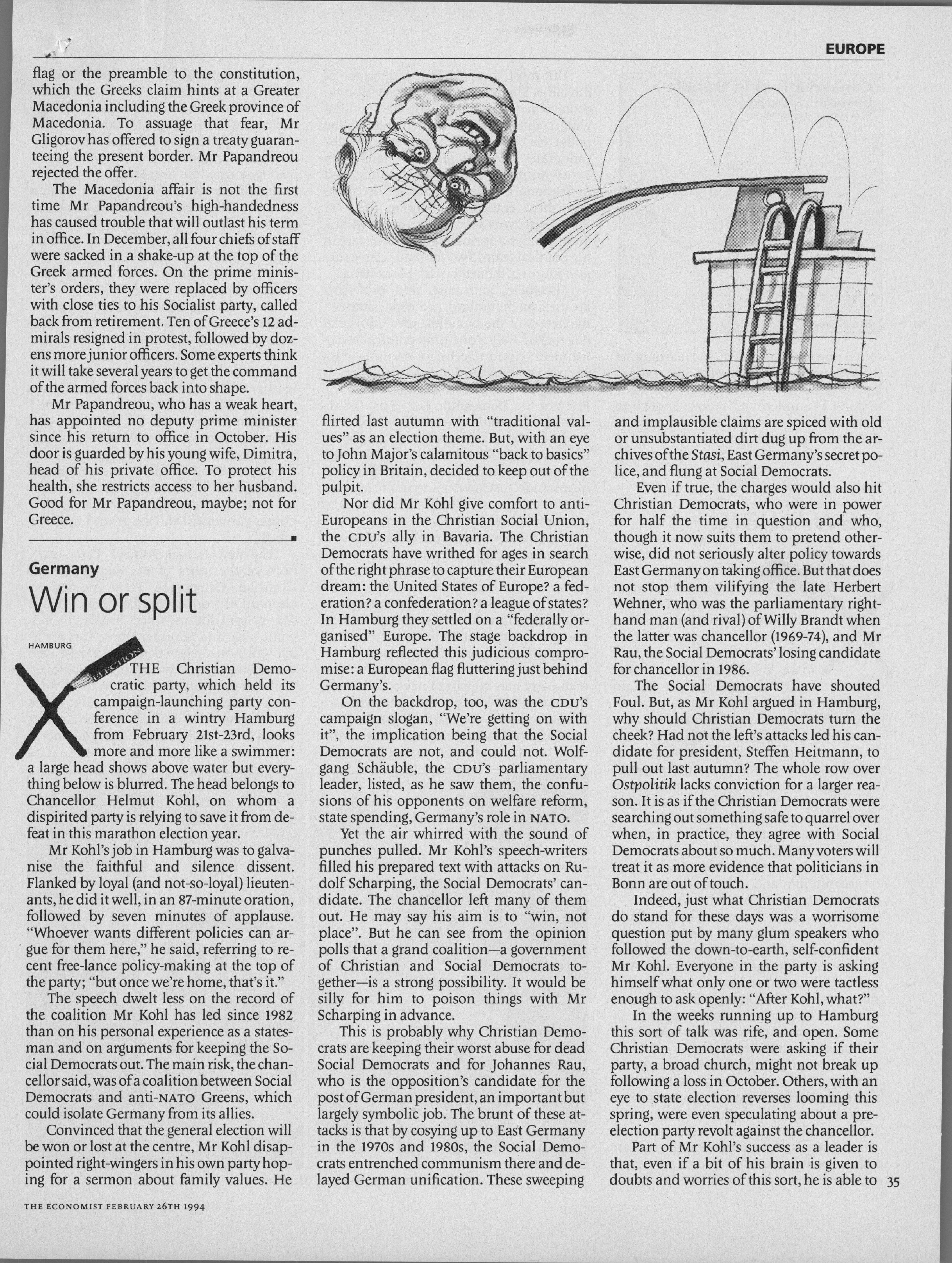 Δημοσίευμα στο περιοδικό The Economist, σχετικά με το συνέδριο του κόμματος του Καγκελάριου kohl,Helmut και τους συσχετισμούς των άλλων κομμάτων της Γερμανίας για τις επερχόμενες εκλογές. Το άρθρο σημειώνει την πτώση του κόμματος του Καγκελαρίου στις δημοσκοπήσεις.