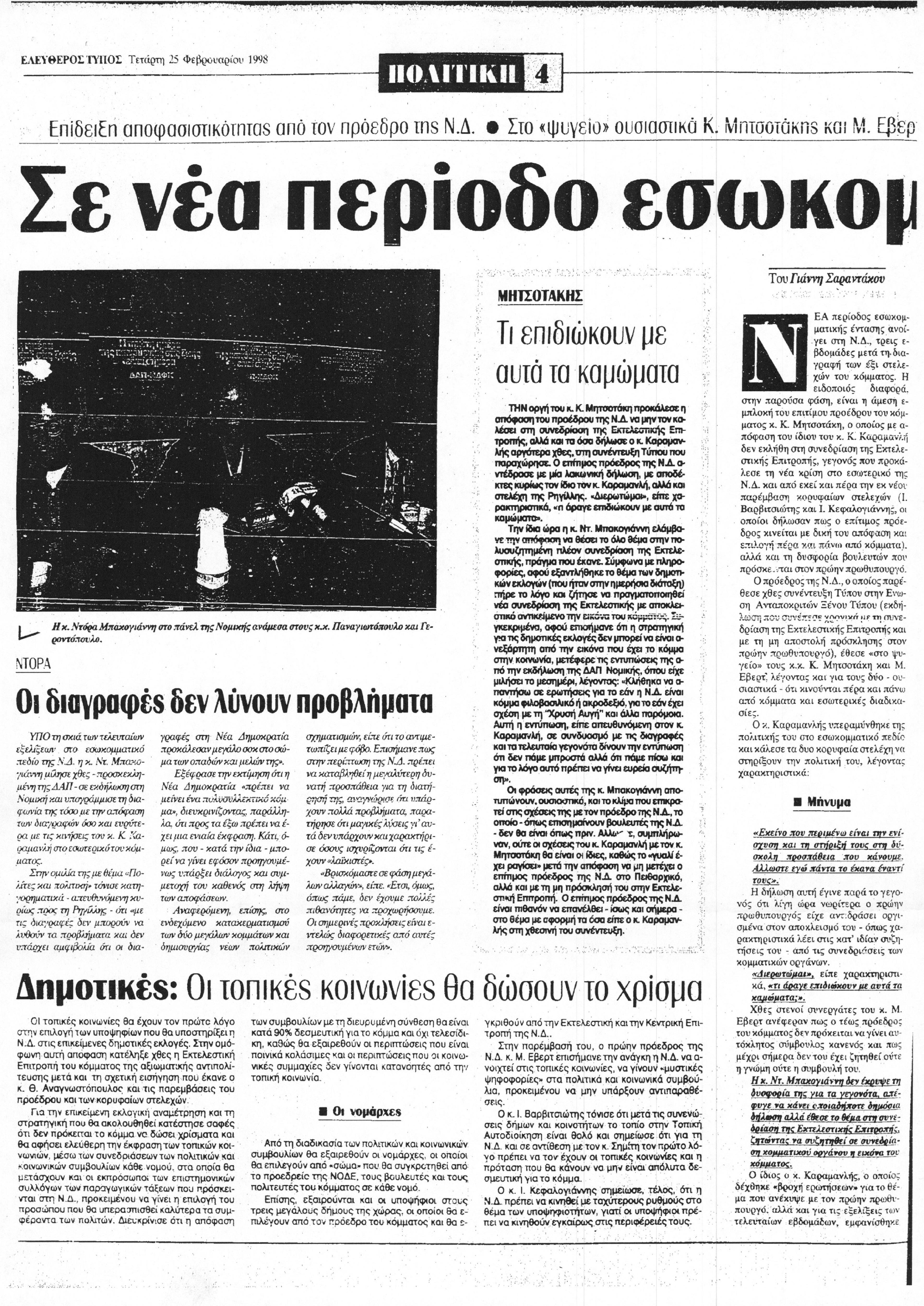Δημοσίευμα στην εφημερίδα Ελεύθερος Τύπος σχετικά με τη δυσαρέσκεια ΚΜ, μετά από τη διαγραφή 6 βουλευτών από το κόμμα της ΝΔ, από τον Καραμανλή,Κωνσταντίνο και τη μη κλήση του τελευταίου στη συνεδρίαση της Εκτελεστικής Επιτροπής του κόμματος. Ο ΚΜ συνομιλεί με βουλευτές του κόμματος και επεξεργάζεται σενάρια δημιουργία νέου κόμματος, καθότι βλέπει να απομονώνεται από το κόμμα της ΝΔ.