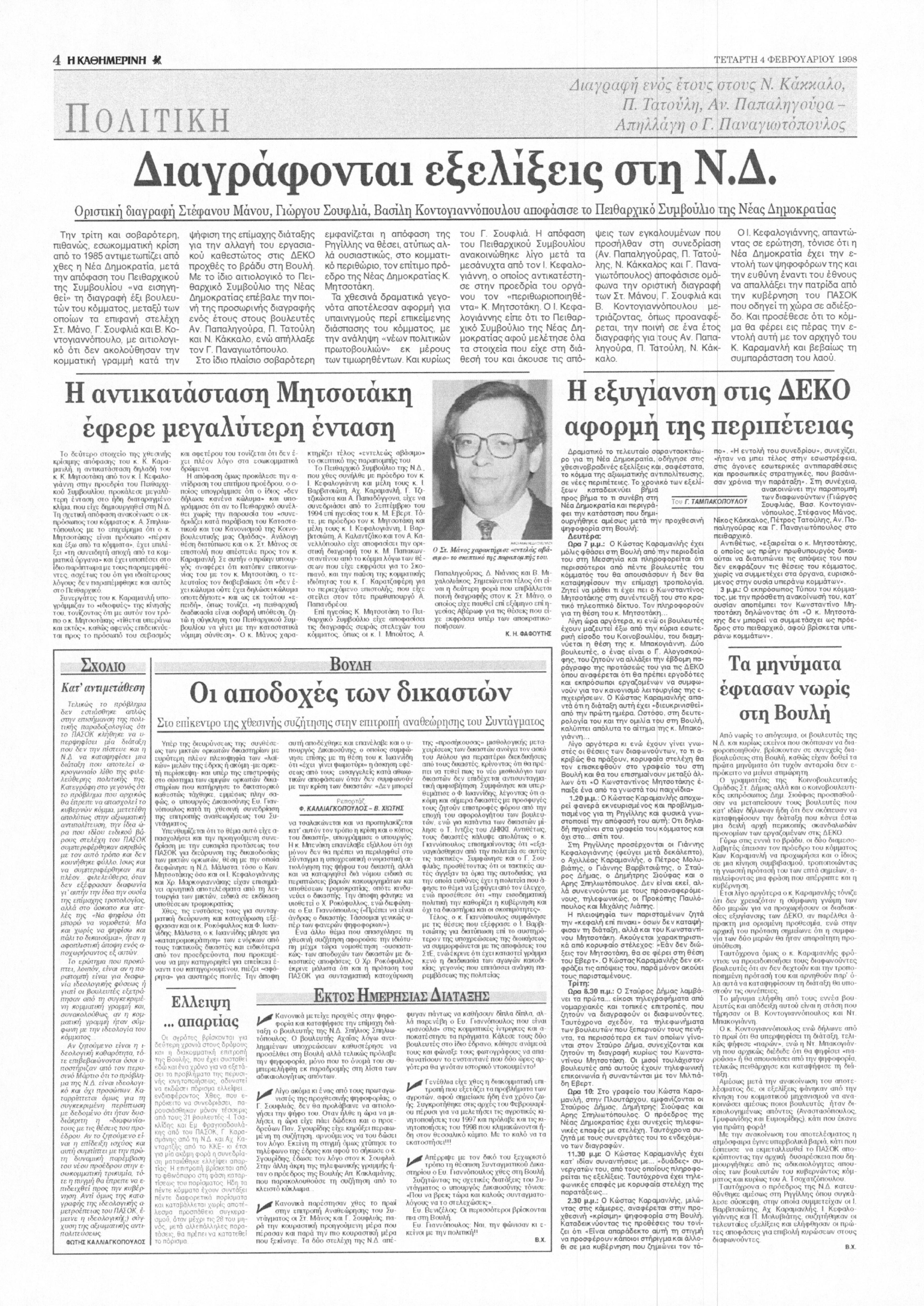 Δημοσιεύματα (άρθρα) στην εφημερίδα Η Καθημερινή σχετικά με τις εντάσεις που αναπτύσσονται στο εσωτερικό της ΝΔ και τη διαγραφή ηγετικών στελεχών της, από τον Πρόεδρο Καραμανλή,Κωνσταντίνο, εν όψει ψήφισης ή μη τροπολογίας του ΠΑΣΟΚ για την εξυγίανση των ΔΕΚΟ.