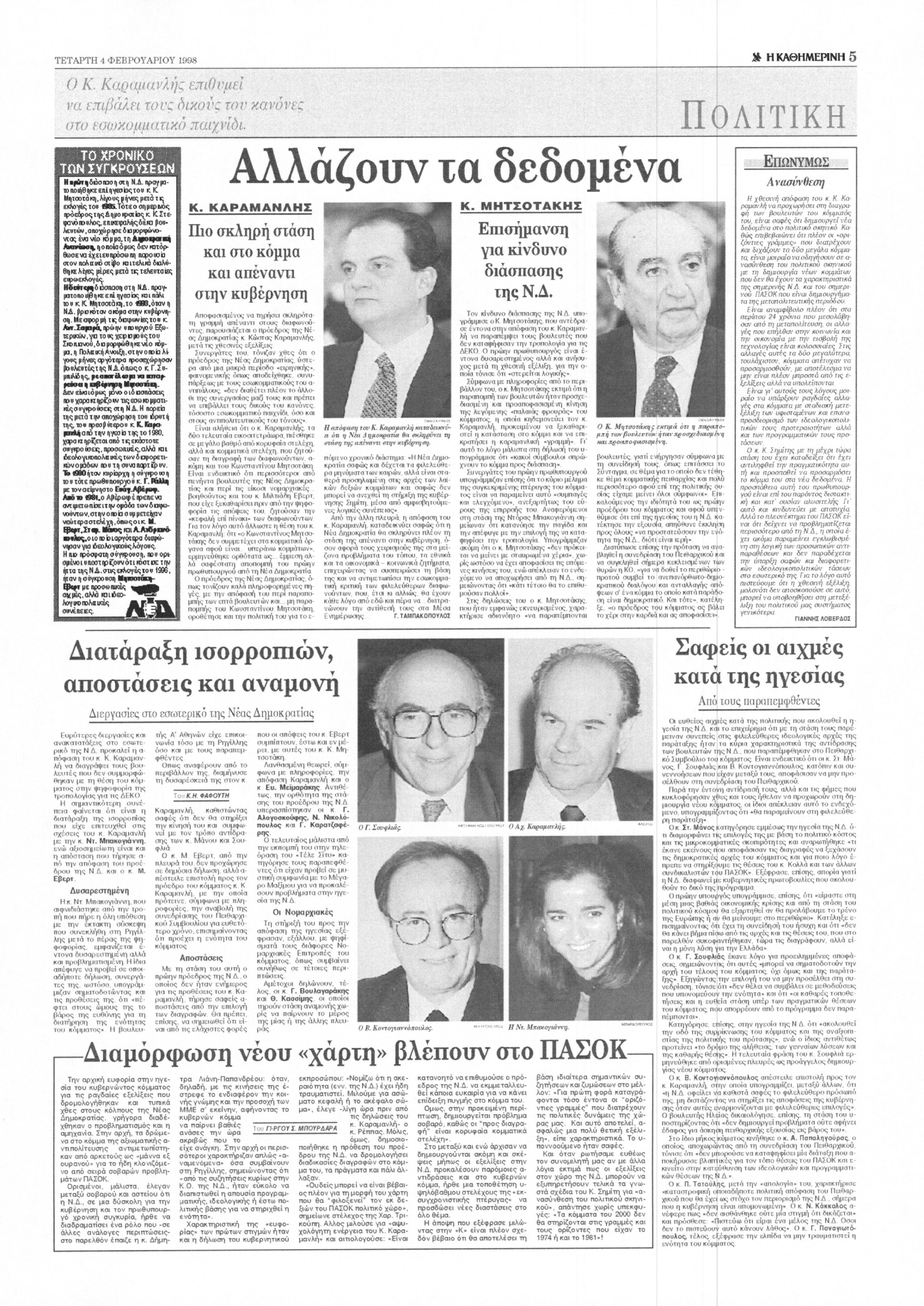 Δημοσιεύματα (άρθρα) στην εφημερίδα Η Καθημερινή σχετικά με τις εντάσεις που αναπτύσσονται στο εσωτερικό της ΝΔ και τη διαγραφή ηγετικών στελεχών της, από τον Πρόεδρο Καραμανλή,Κωνσταντίνο, εν όψει ψήφισης ή μη τροπολογίας του ΠΑΣΟΚ για την εξυγίανση των ΔΕΚΟ.