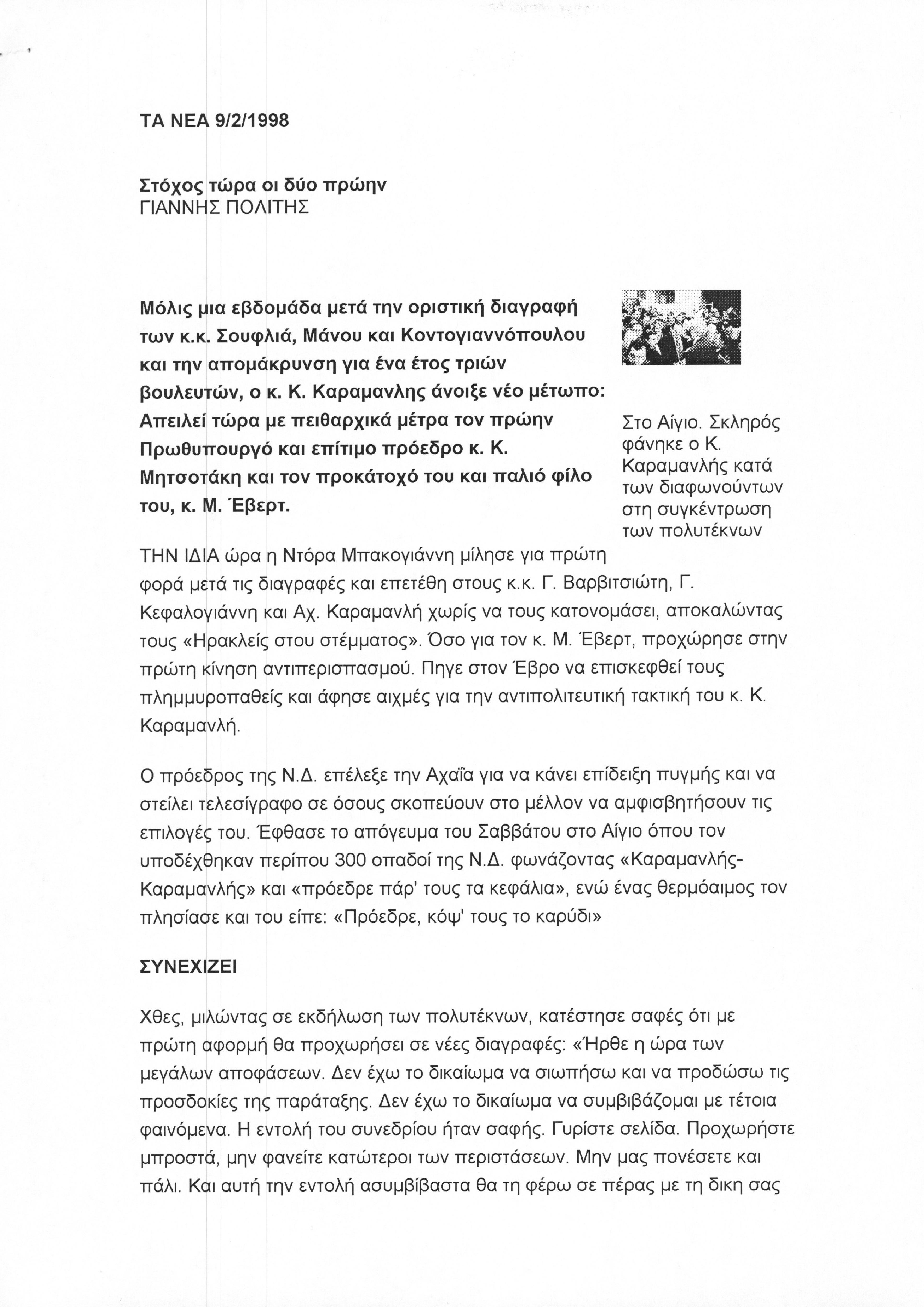 Δημοσίευμα στην εφημερίδα Τα Νέα, όπου στον απόηχο των διαγραφών 6 βουλευτών του κόμματος της ΝΔ, ο Κ. Καραμανλή, απειλεί με πειθαρχικά μέτρα τον πρώην πρωθυπουργό και επίτιμο πρόεδρο ΚΜ και τον προκάτοχό του και παλιό φίλο κ. Εβερτ,Μιλτιάδη. Εντονη κινητικότητα στελεχών της ΝΔ και φήμες από τους διαγραφέντες για δημιουργία νέου κόμματος.