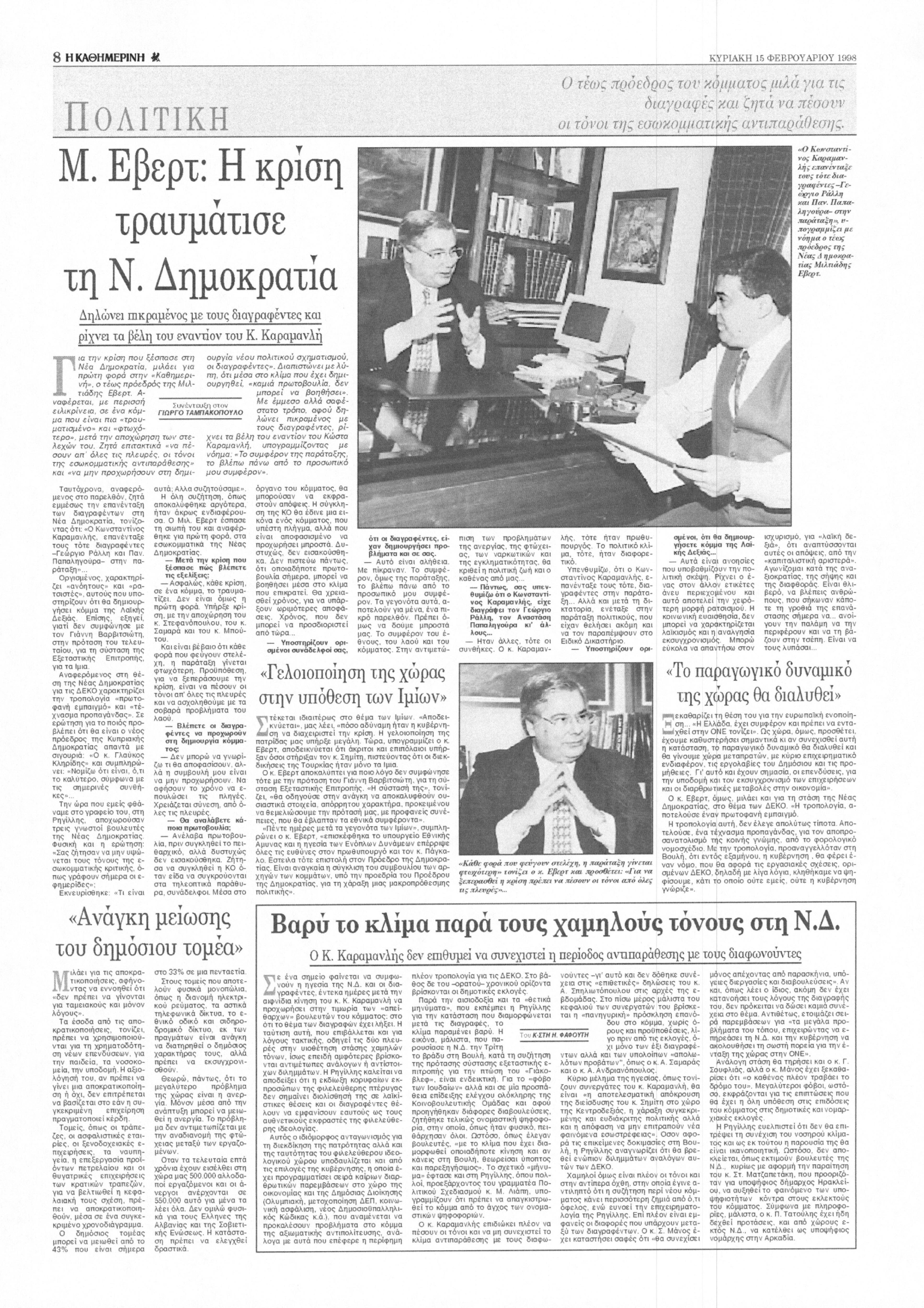 Δημοσίευμα στην εφημερίδα Η Καθημερινή, όπου ο Μιλτιάδης Εβερτ σχολιάζει τα γεγονότα της κρίσης, στο κόμμα της Ν.Δ. σχετικά με τις πρόσφατες διαγραφές κορυφαίων στελεχών της.