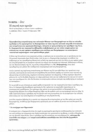 Δημοσίευμα στο Το Βήμαonline σχετικά με τις κινήσεις Κ. Καραμανλή, μετά τη διαγραφή κορυφαίων στελεχών της ΝΔ. Ο πρόεδρος της ΝΔ αναλαμβάνει πρωτοβουλίες υπερκάλυψης των πολιτικών θέσεων των διαγραφέντων.