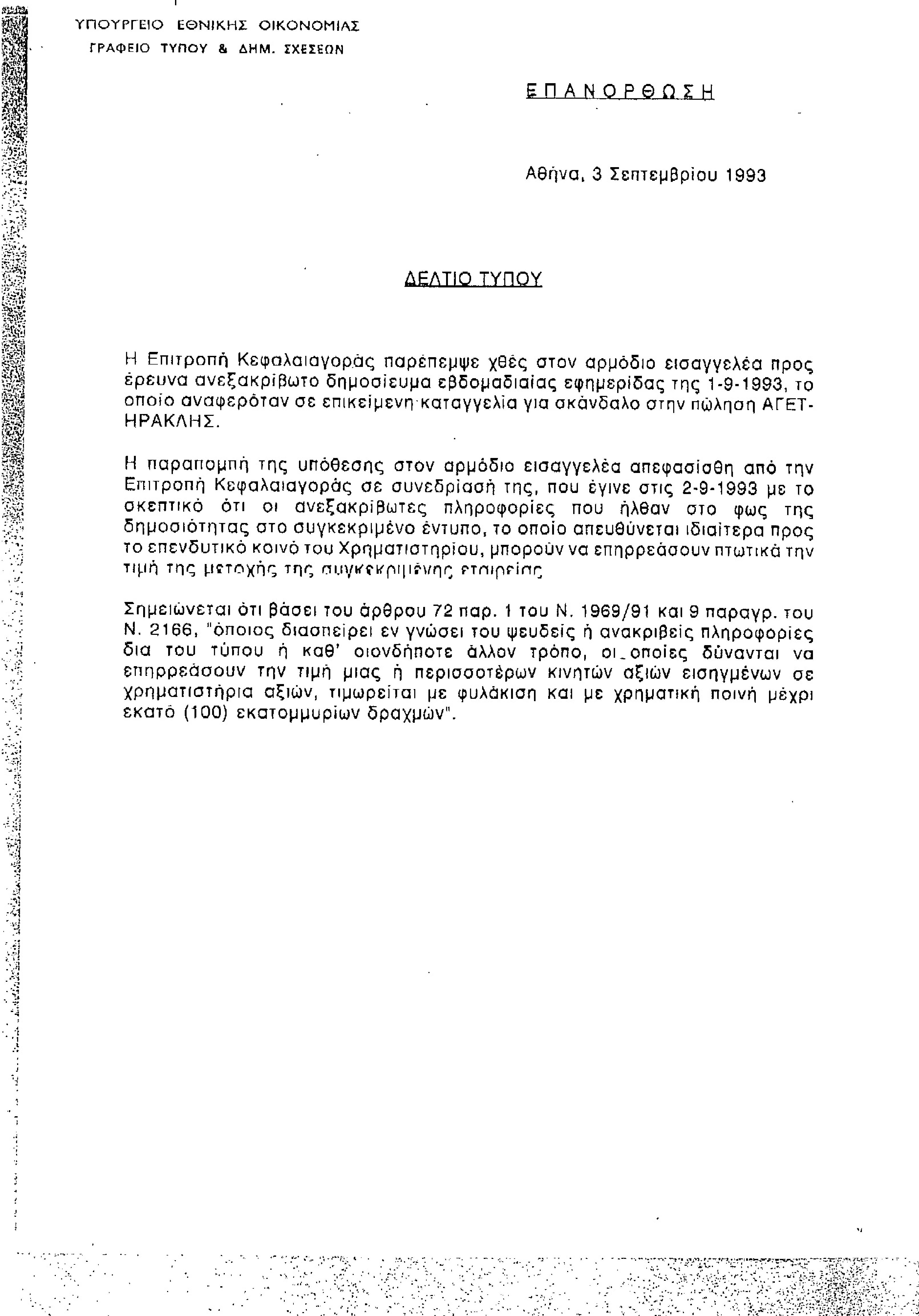 Δελτίο τύπου του Υπουργείου Εθνικής Οικονομίας σχετικά με την καταγγελία για σκάνδαλο στην πώληση της ΑΓΕΤ-ΗΡΑΚΛΗΣ
