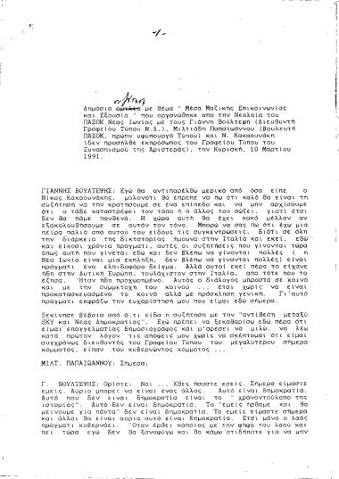Πρακτικό συζήτησης με θέμα Μέσα Μαζικής Επικοινωνίας και Εξουσία που οργανώθηκε από τη Νεολαία του ΠΑΣΟΚ της Νέας Ιωνίας