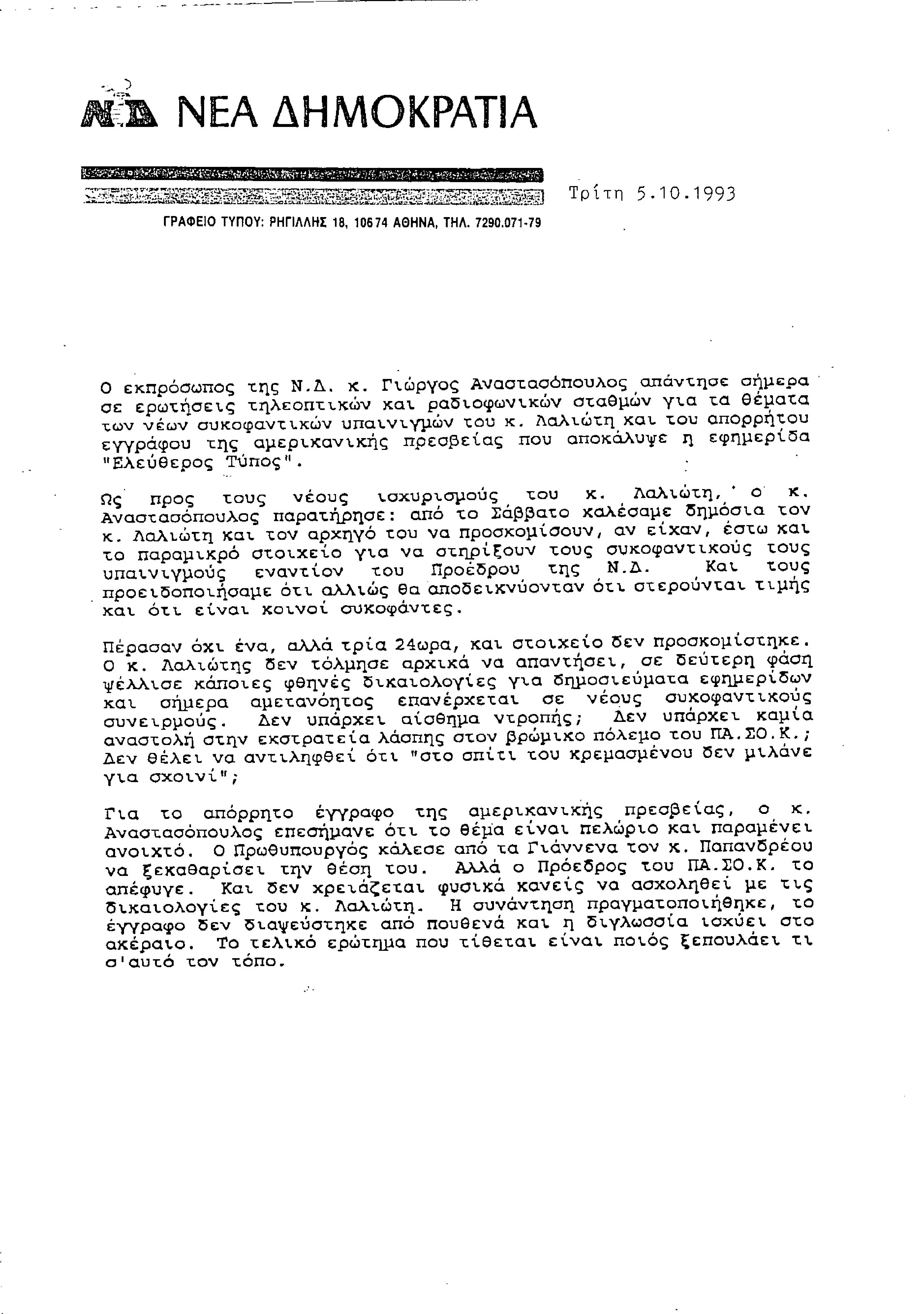 Δελτίο τύπου ΝΔ σχετικά με τις απαντήσεις του εκπροσώπου της ΝΔ Γιώργου Αναστασόπουλου στους ισχυρισμούς του Κώστα Λαλιώτη