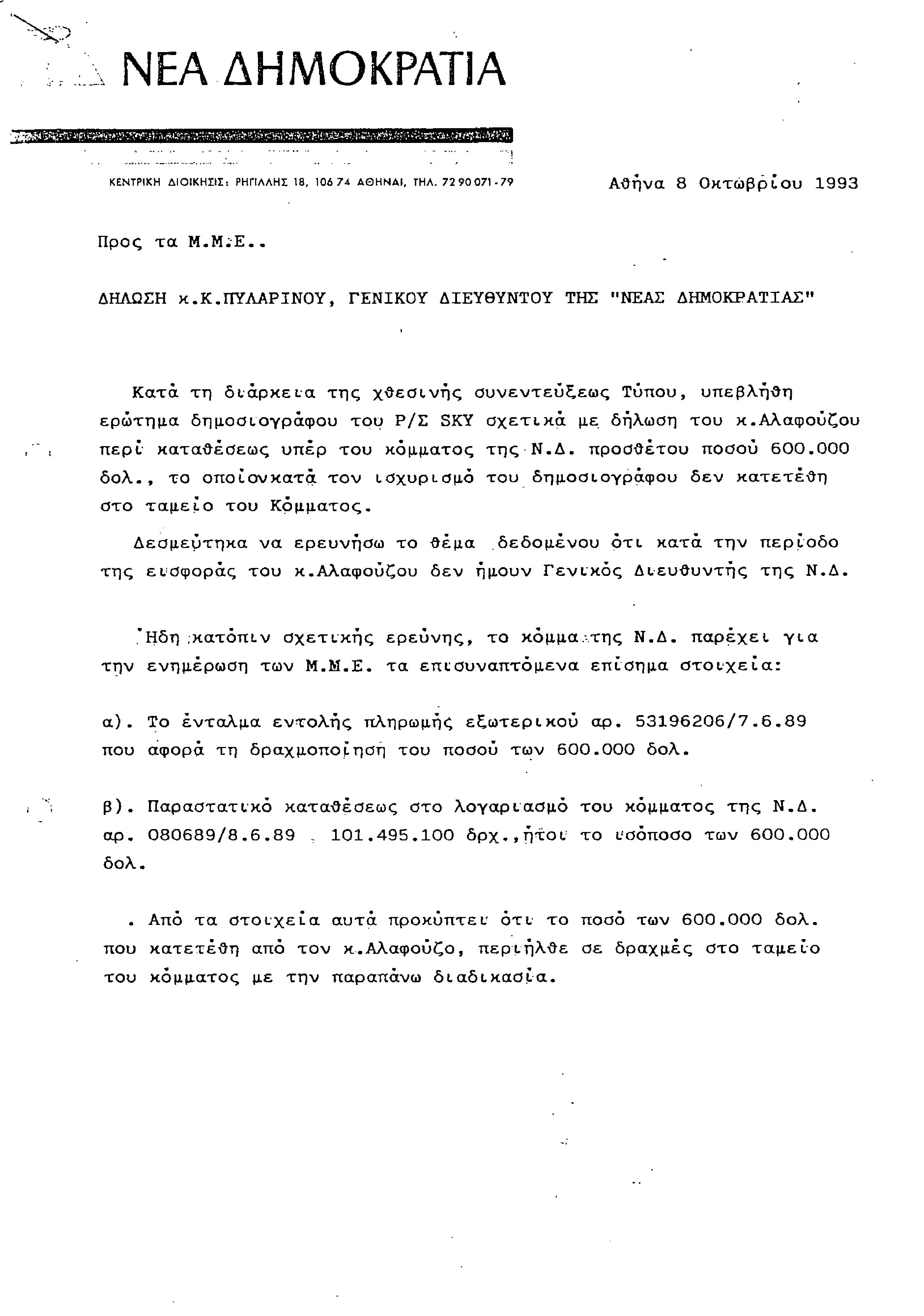 Δελτίο τύπου ΝΔ σχετικά με δήλωση του γενικού διευθυντή της ΝΔ Κώστα Πυλαρινού προς τα ΜΜΕ για κατάθεση χρηματικού ποσού από τον Αλαφούζο υπέρ της ΝΔ