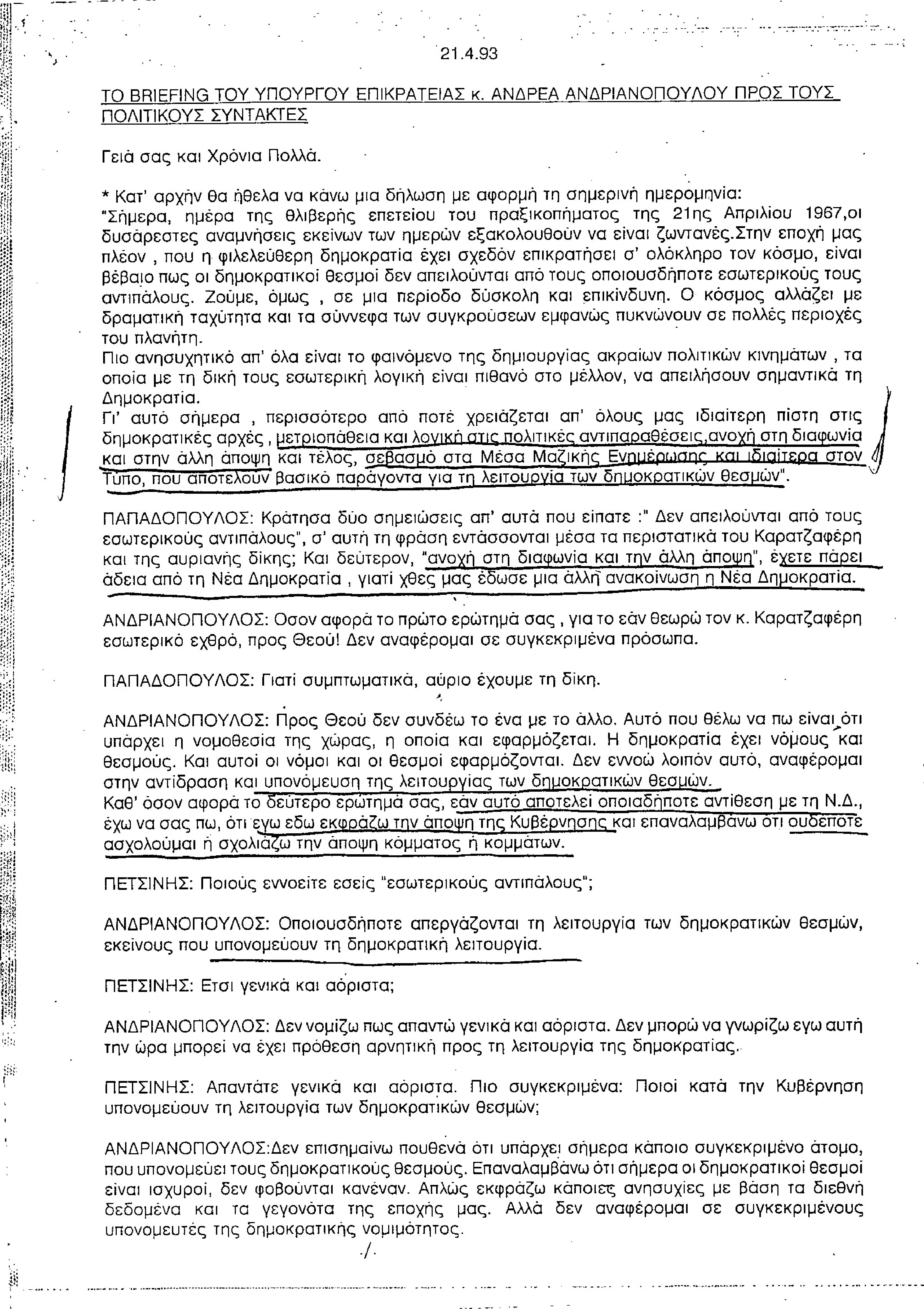 Το briefing του υπουργού επικρατείας κ. Ανδρέα Ανδριανόπουλου προς τους πολιτικούς συντάκτες
