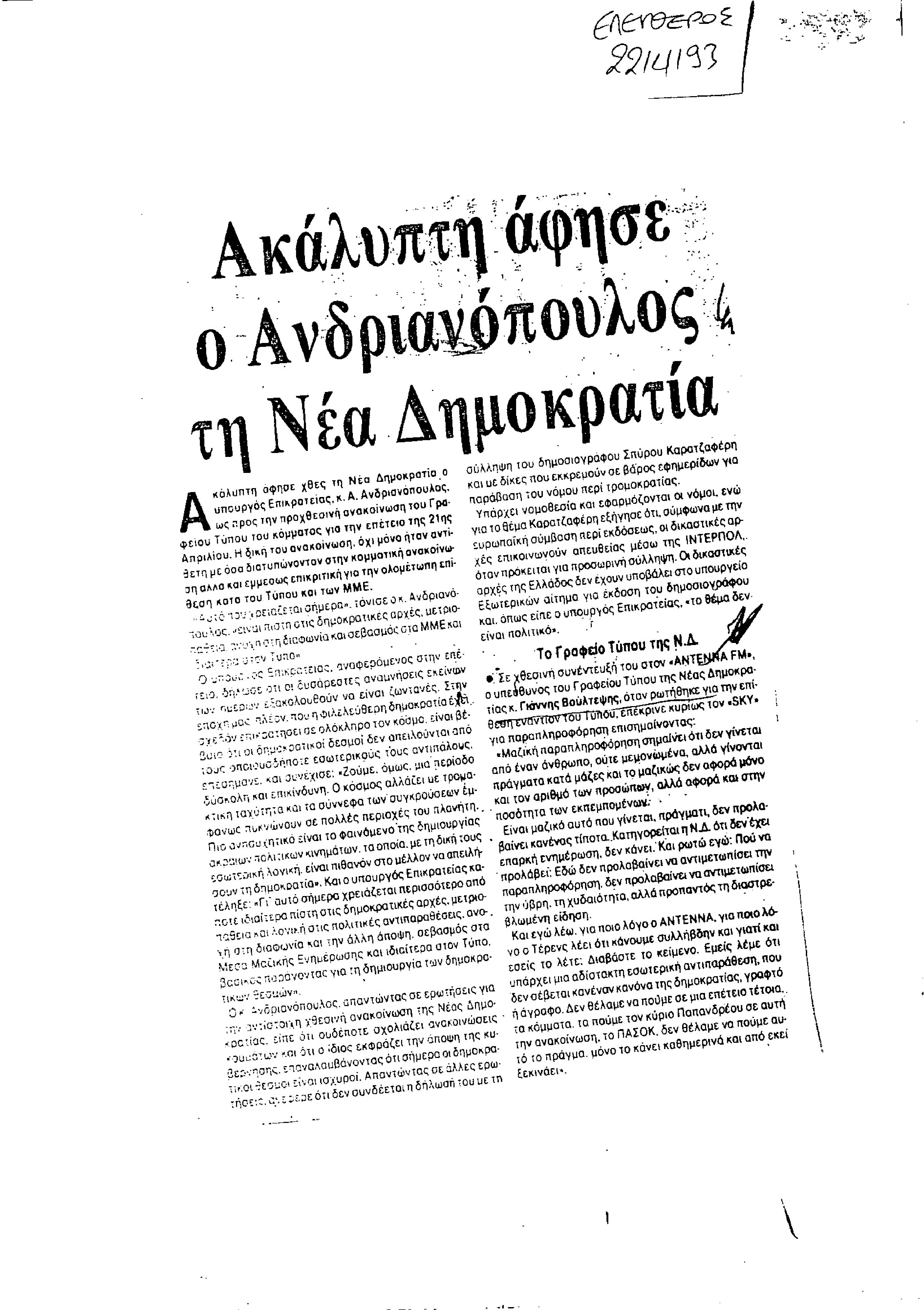 Δημοσίευμα εφημερίδας Ελεύθερος