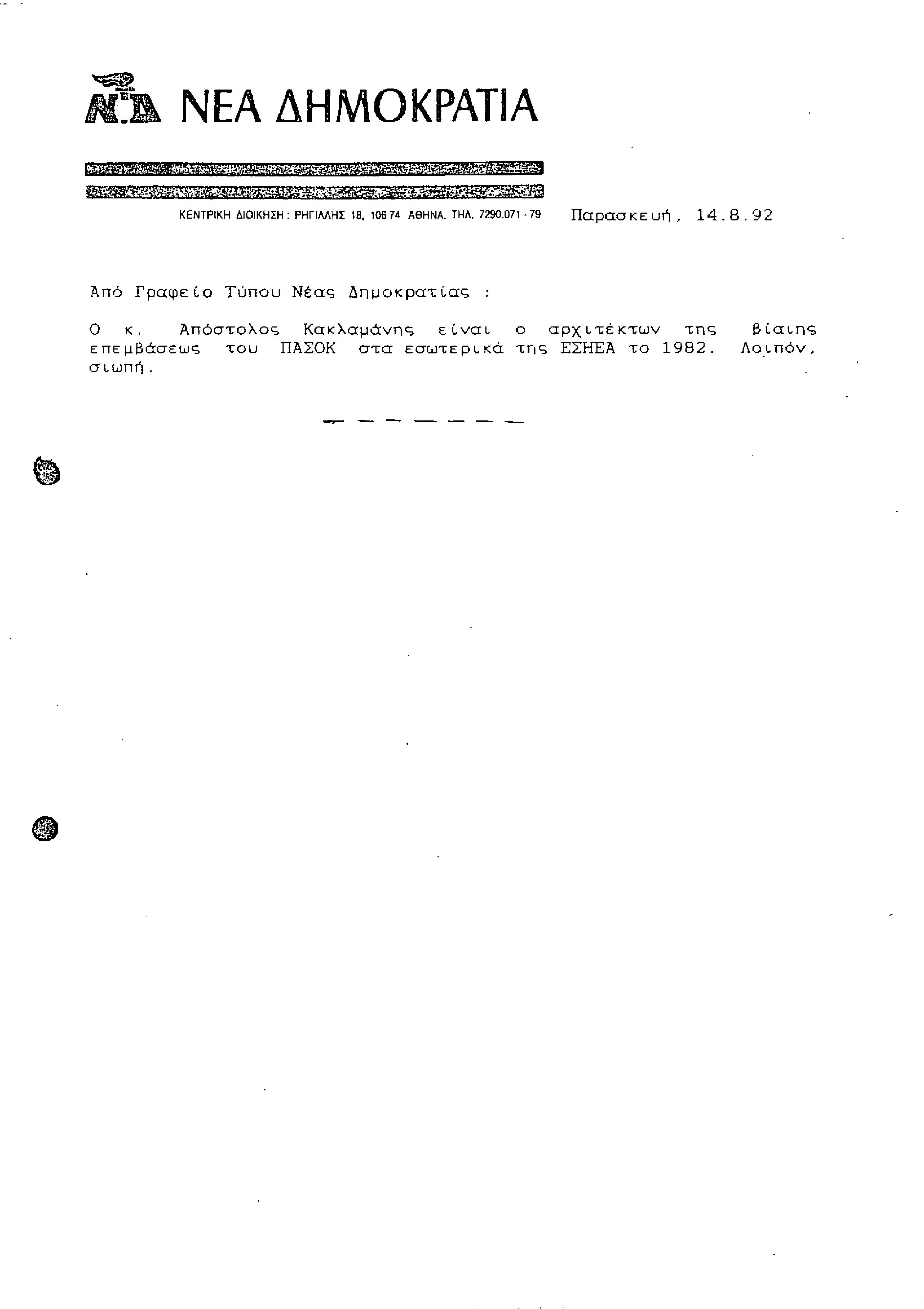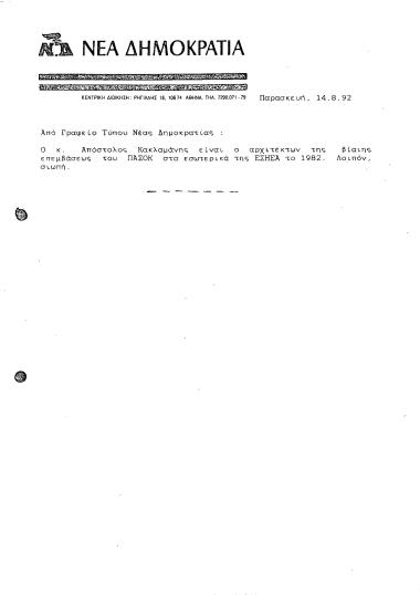Δελτίο τύπου ΝΔ σχετικά με τον Απόστολο Κακλαμάνη και την ΕΣΗΕΑ