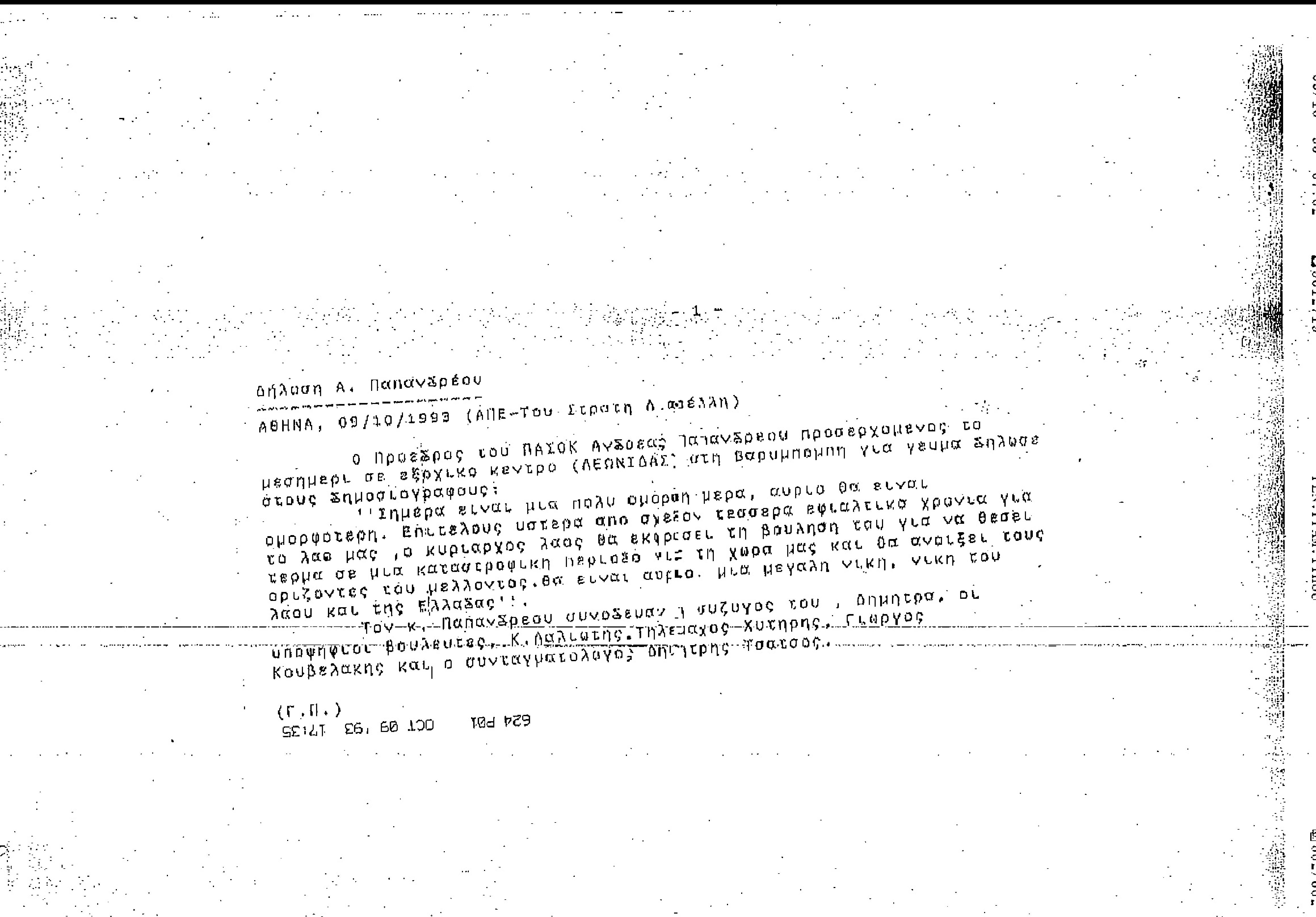 Τέλεξ ΑΠΕ σχετικά με δήλωση του Ανδρέα Παπανδρέου στους δημοσιογράφους