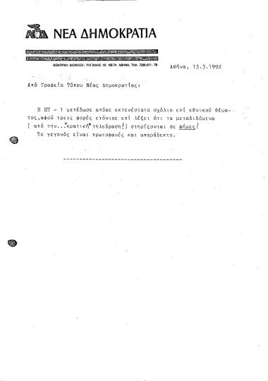 Δελτίο τύπου ΝΔ σχετικά με σχόλιο της ΕΤ-1 για εθνικό θέμα