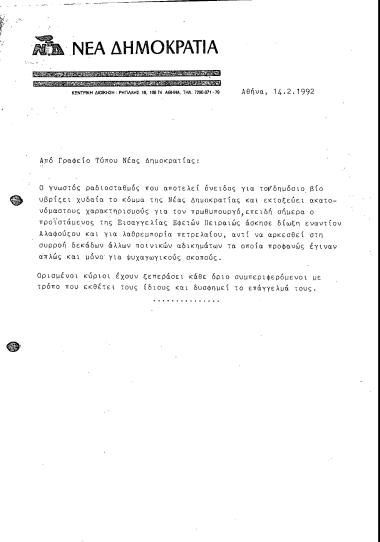 Δελτίο τύπου ΝΔ σχετικά με τη δικαστική δίωξη εναντίον του Αλαφούζου για λαθρεμπορία πετρελαίου