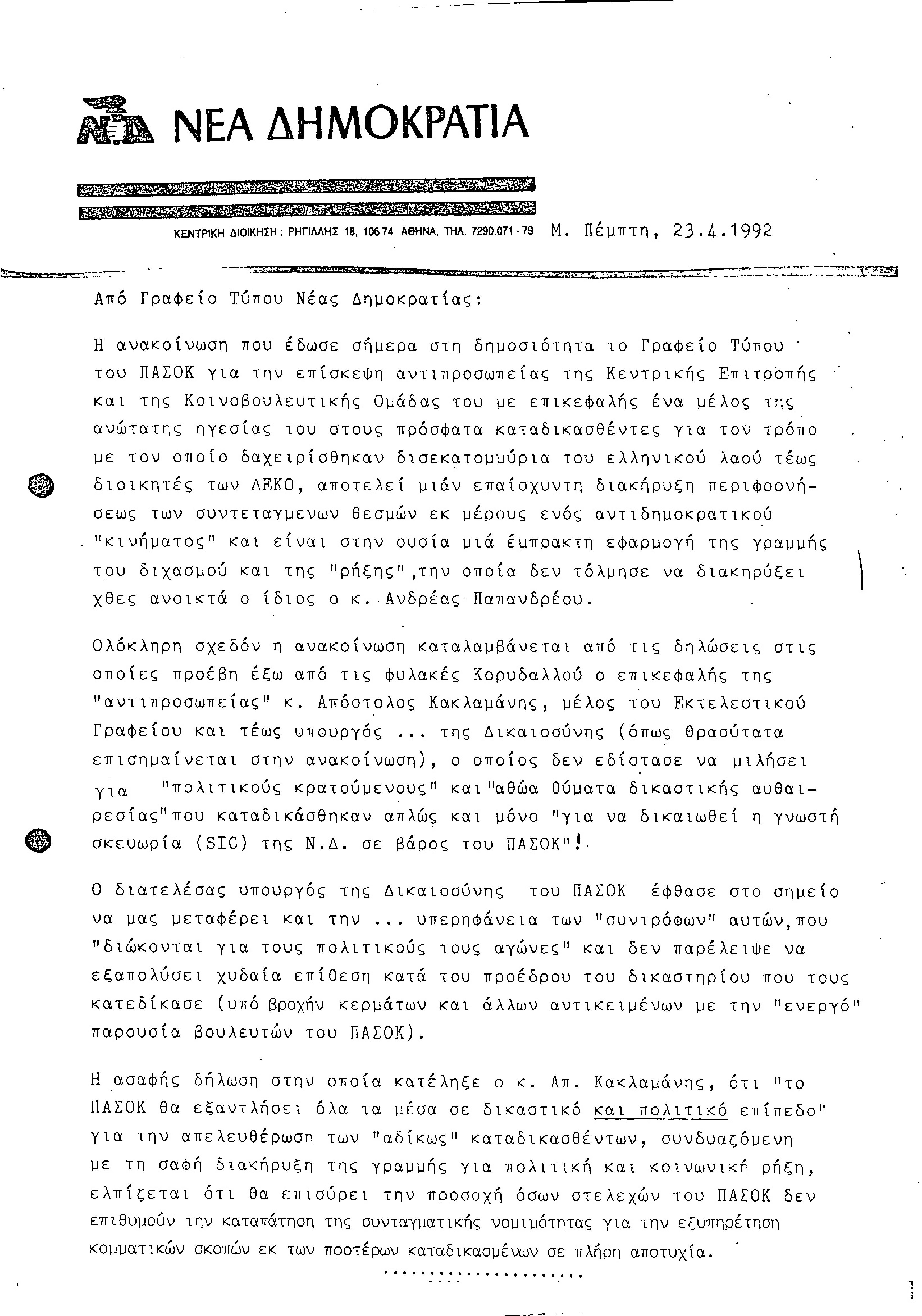 Δελτίο τύπου ΝΔ σχετικά με ανακοίνωση του Γραφείου Τύπου του ΠΑΣΟΚ για τους καταδικασθέντες τέως διοικητές των ΔΕΚΟ