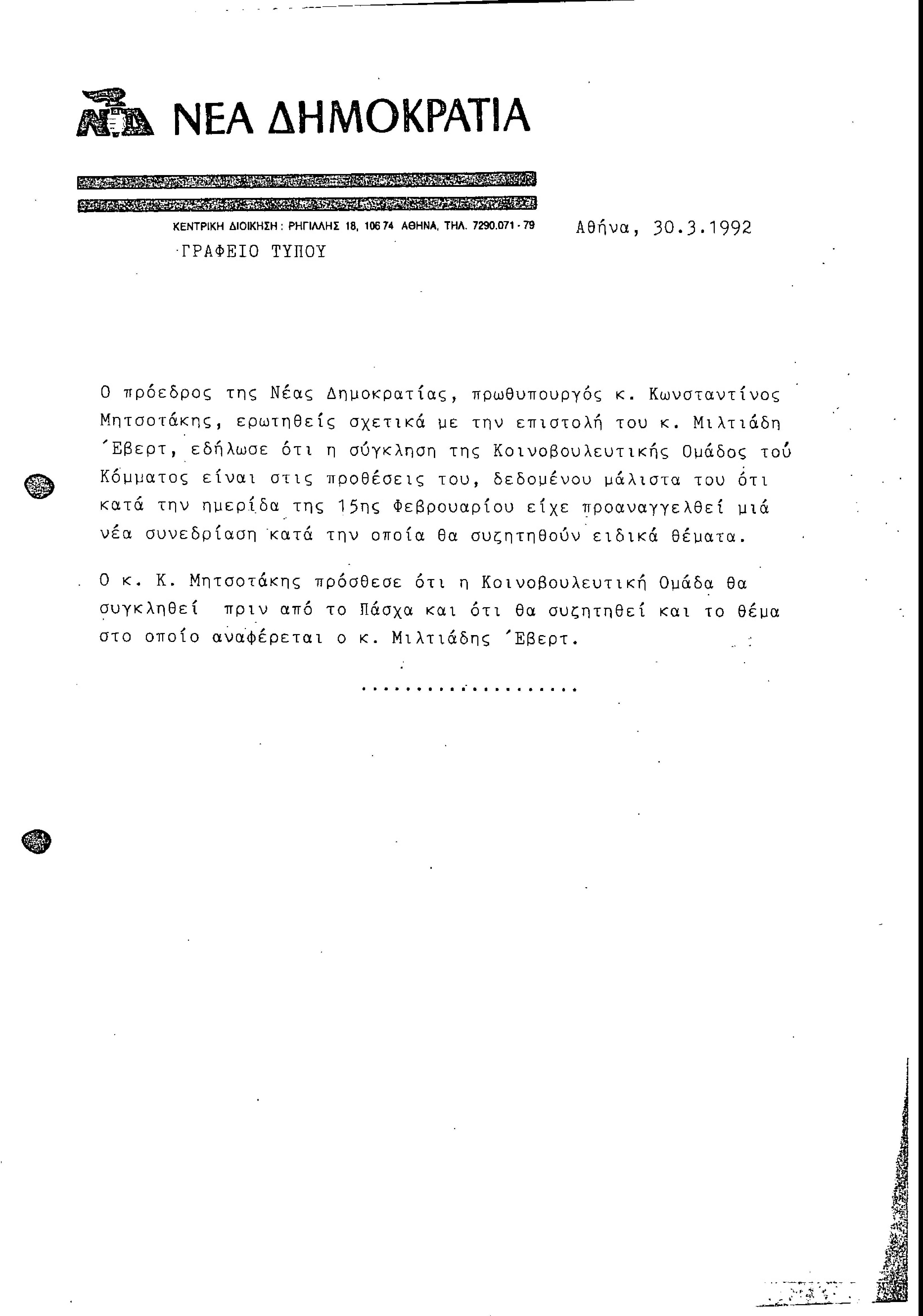 Δελτίο τύπου ΝΔ σχετικά με επιστολή του Μιλτιάδη Έβερτ για τη σύγκληση της ΚΟ της ΝΔ
