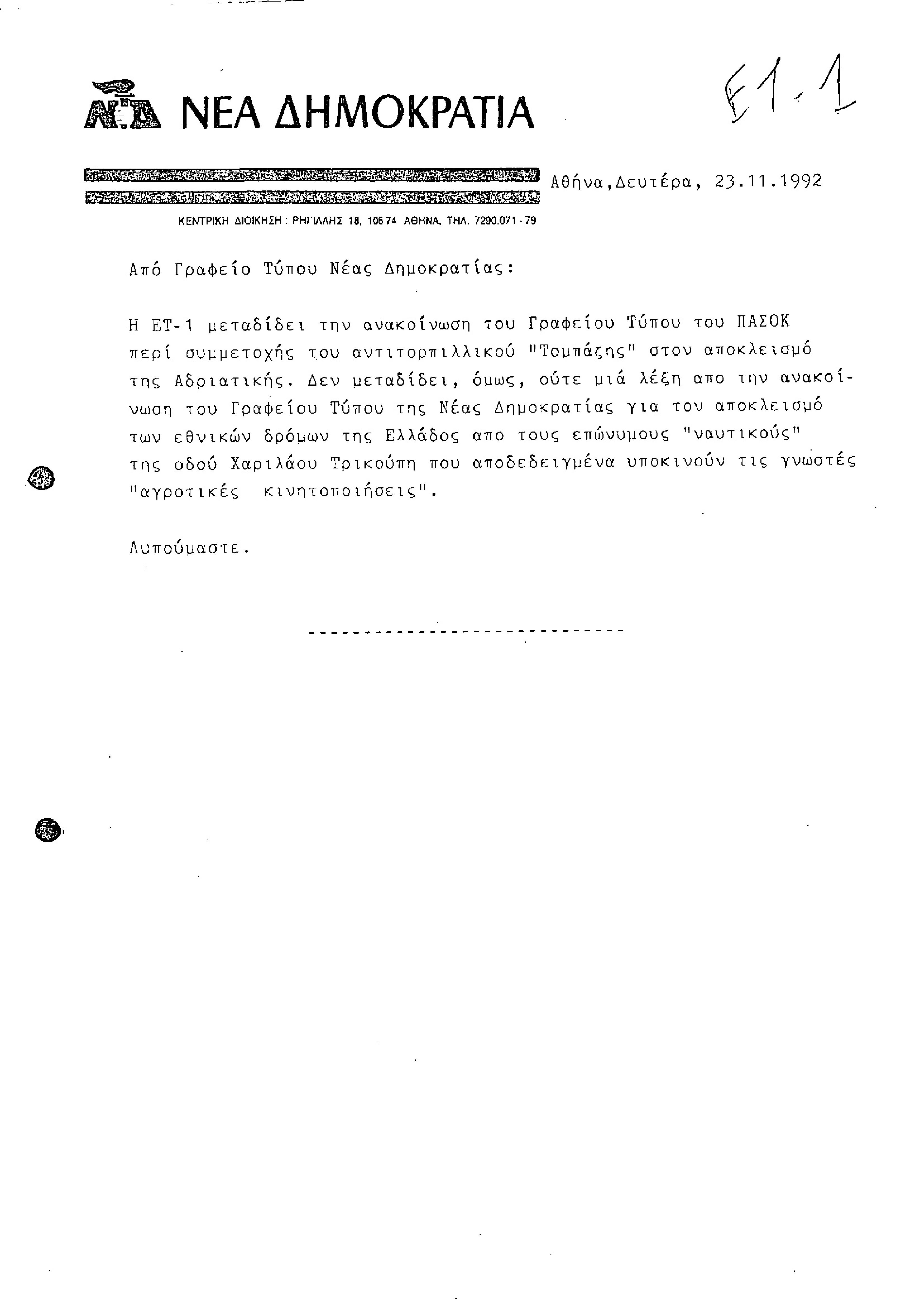 Δελτίο τύπου ΝΔ σχετικά με την ΕΤ-1