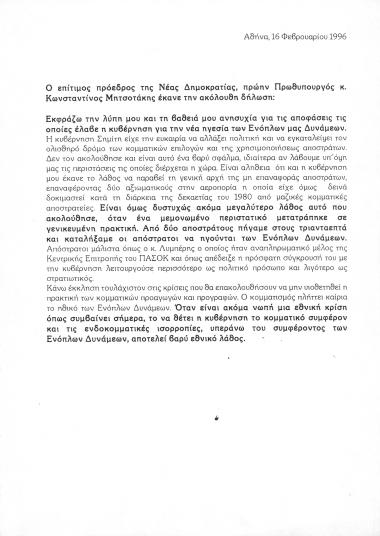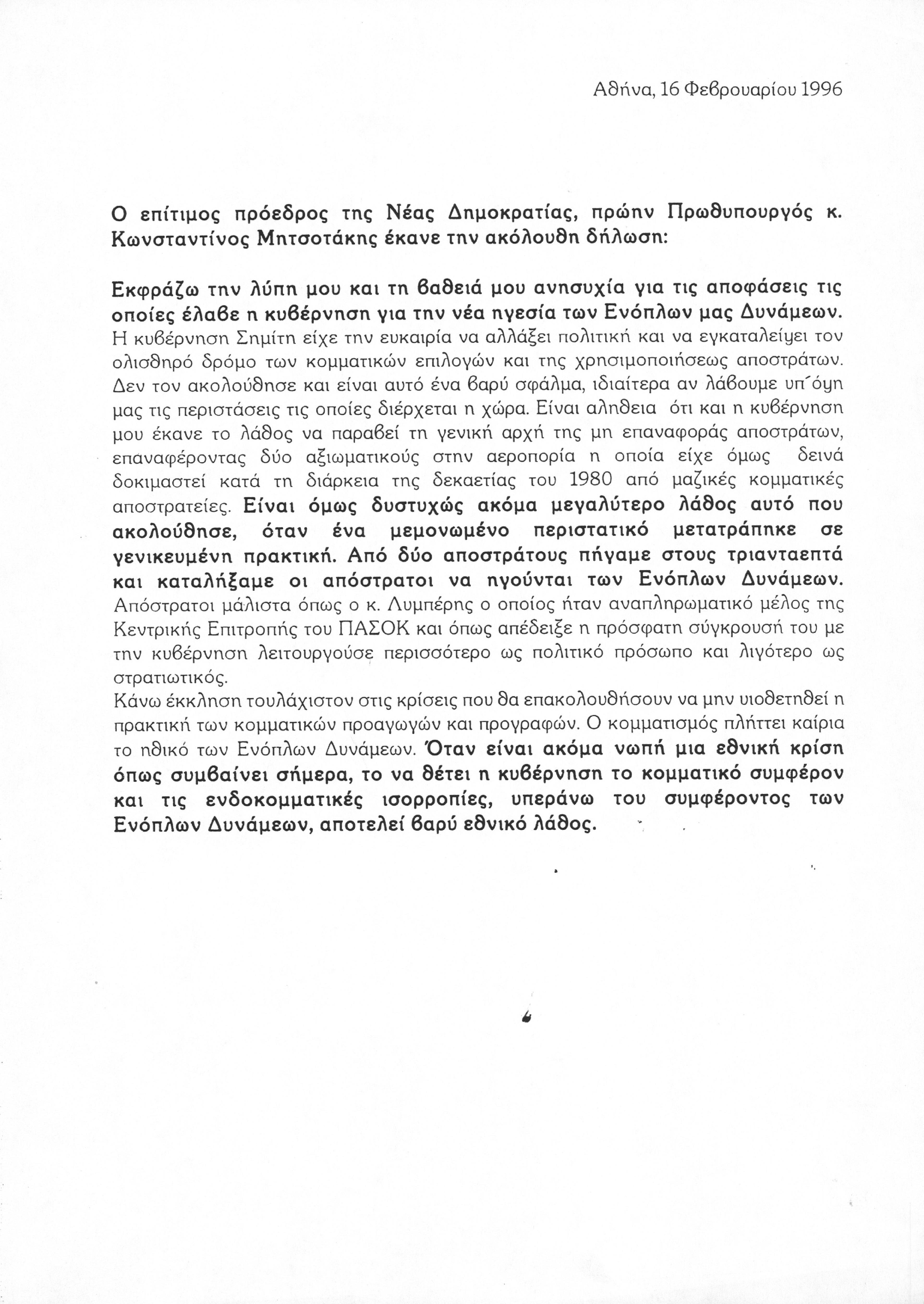 Δήλωση ΚΜ σχετικά με την απόφαση της κυβέρνησης για την ηγεσία των Ενόπλων Δυνάμεων